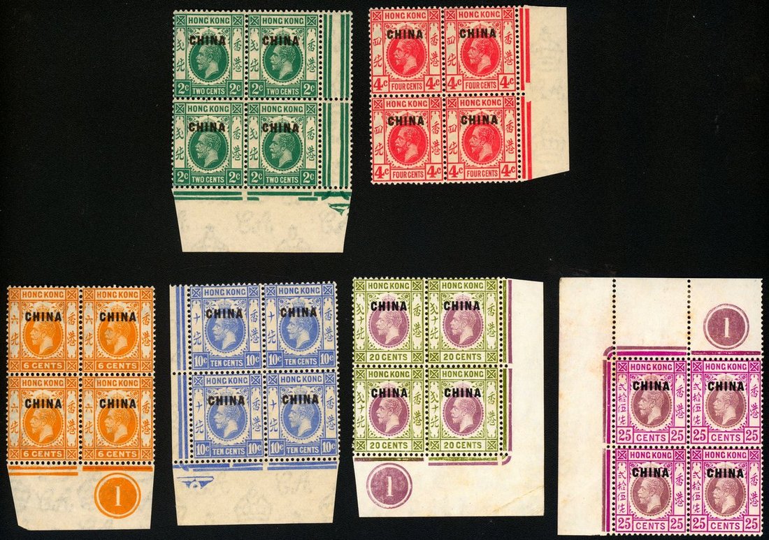 1922-27 K.G.V. overprint 'CHINA' 2nd series, with multiple Script CA watermark, 2c., 4c., 6c., 10c., 20c. and 25c. all with margin or corner margin, some with plate number, unmounted mint, some gum toning and brown spots, fine. Yang BP18-20, 22-24.