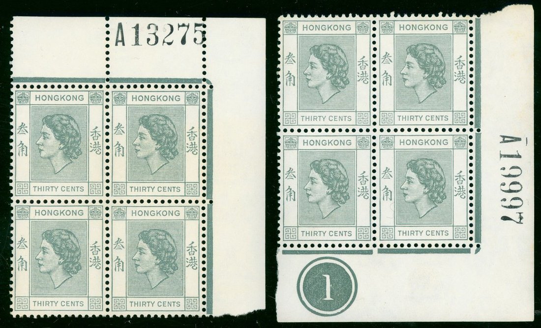 1954 QEII the first issue 30c. top right corner block of four with sheet No. A13275, another lower right corner block of four with requisition letter and sheet No. A19997, unmounted mint, very fine.