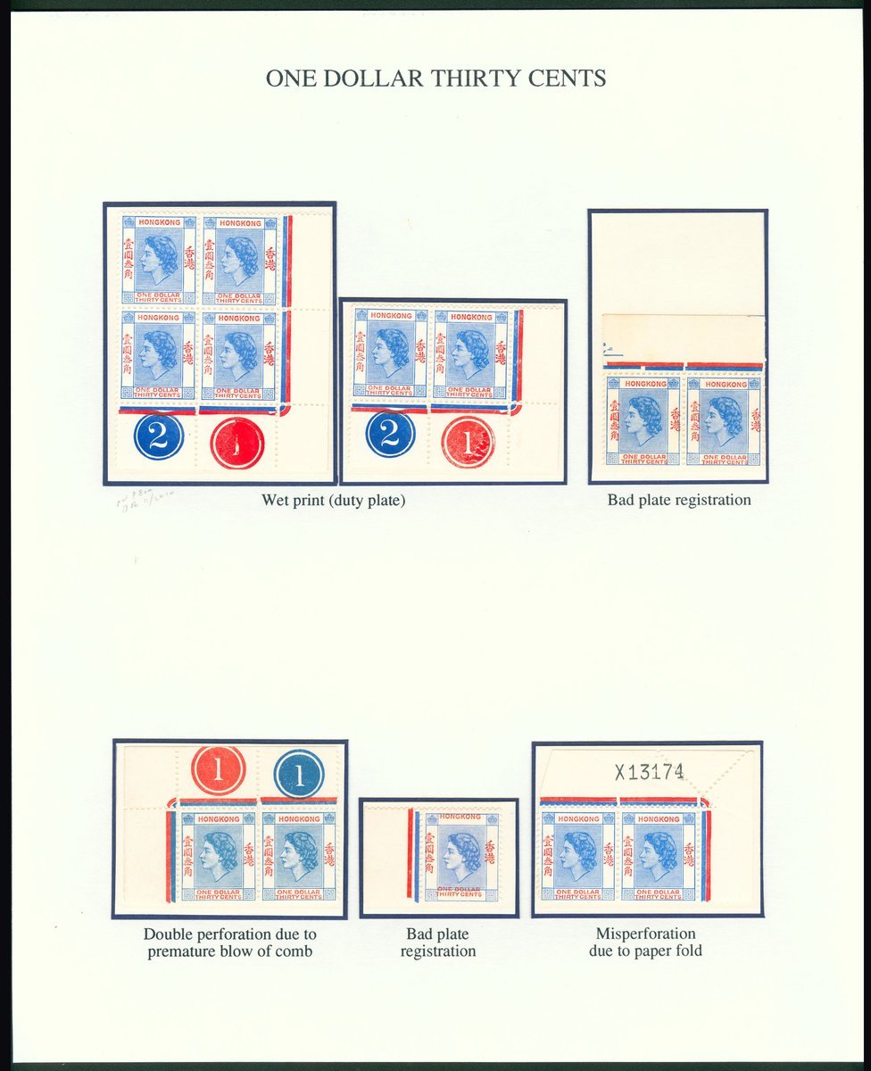 1954 (5 Jan.) Q.E.II the 1st issue, $1.3 in form of single (1), pairs (4) and in a block of four, all with margin and some with corner margin, showing different variety including wet print (duty plate), bad plate registration, double perforation and misperforation due to paper fold, unmounted mint, please review.