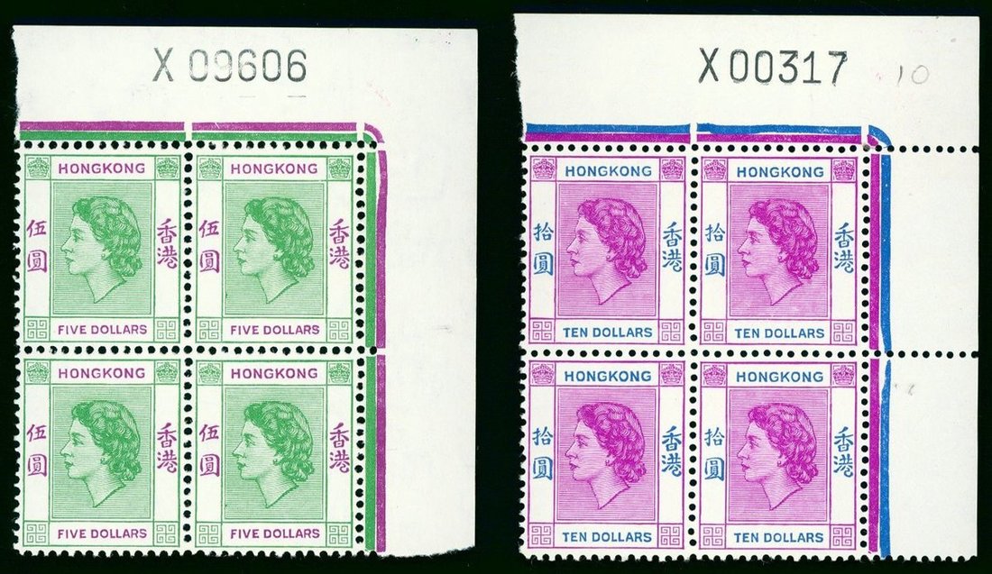 1954 (5 Jan.) R25 Q.E.II the 1st issue, 5c. to $10, all in block of four with top right corner margin and complete values with requisition number (X), fine unmounted mint.