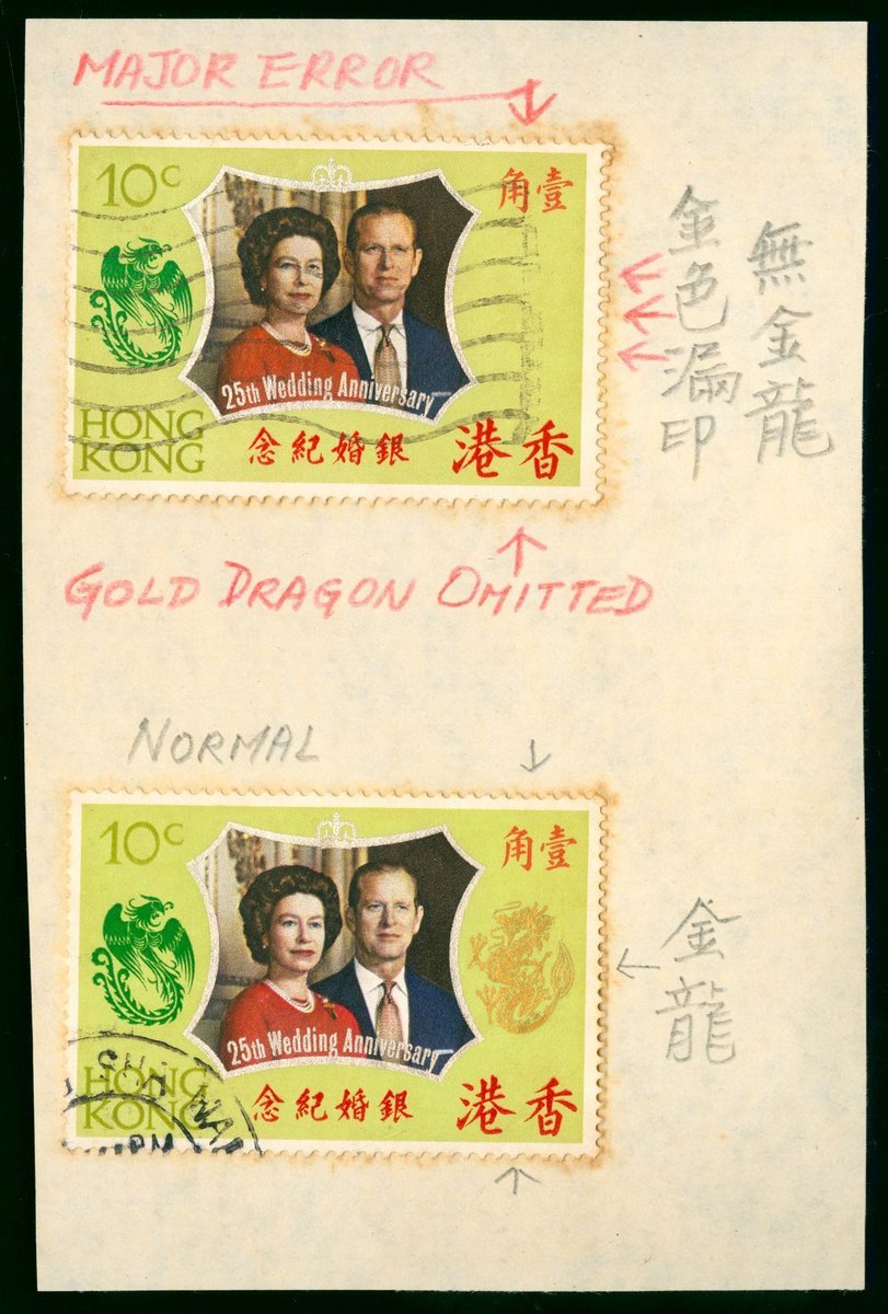 1972 Royal Silver Wedding 10c. with gold omitted variety, used. also another used stamp for comparison, light toning. SG 279a