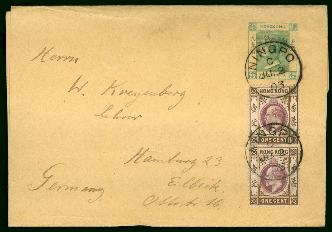 1903 (2 Jun.) Q.V. newswrapper 2c. green to Germany bearing KEVII 1c. vertical pair tied by Ningpo c.d.s., postal usage very rare.