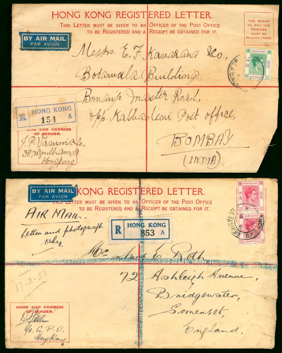 1947 (Jan.) Hong Kong KGVI H size registered postal stationery envelopes 35c (acknowledgement fees 25c) to Bombay franked $5 GPO registered c.d.s., clipped corner. and 1951 (Feb.) 30c (acknowledgement fees 30c) to England franked 80c vertical pair GPO registered c.d.s.