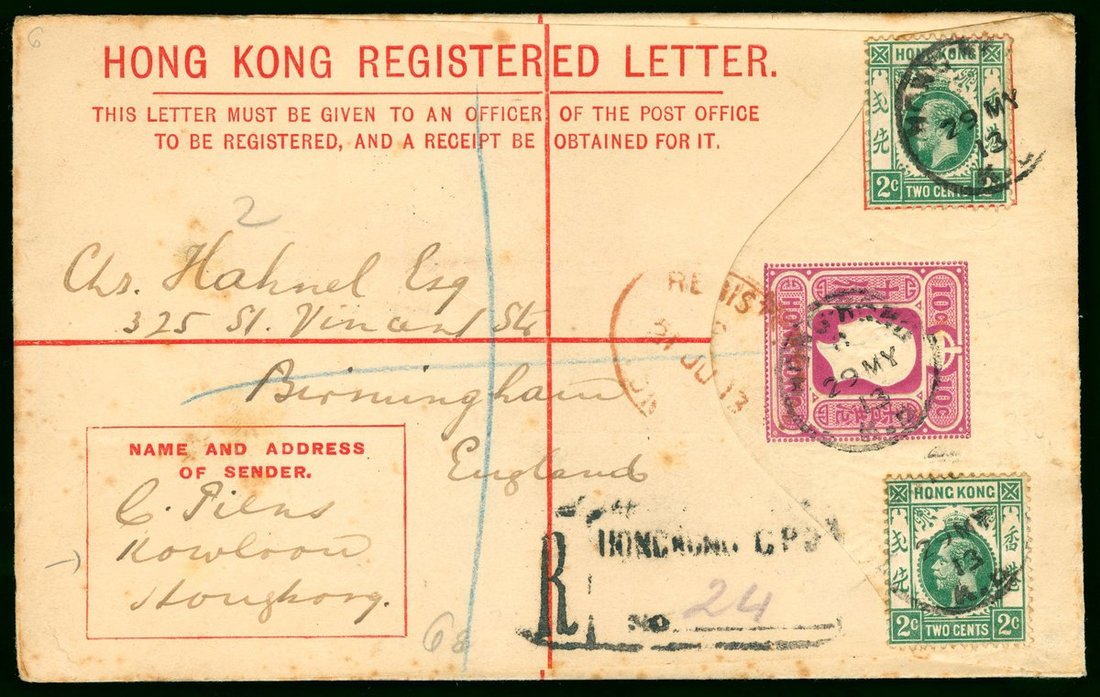1913 (29 May) Hong Kong K.G.V G size 10c registered stationery envelope with 25c for $120 to $2.50 for $1,200 compensation schedule, franked KGV 2c x 2, sent from Kowloon to Birmingham England. Cancelled Small K.b. c.d.s. index C (29.5) Proud D2. Registered Hong Kong double-ring c.d.s. (29.5) and Registered London arrival (21.6), Birmingham arrival (21.6). Proud RL9 Hong Kong GPO cachet used at Kowloon branch office.