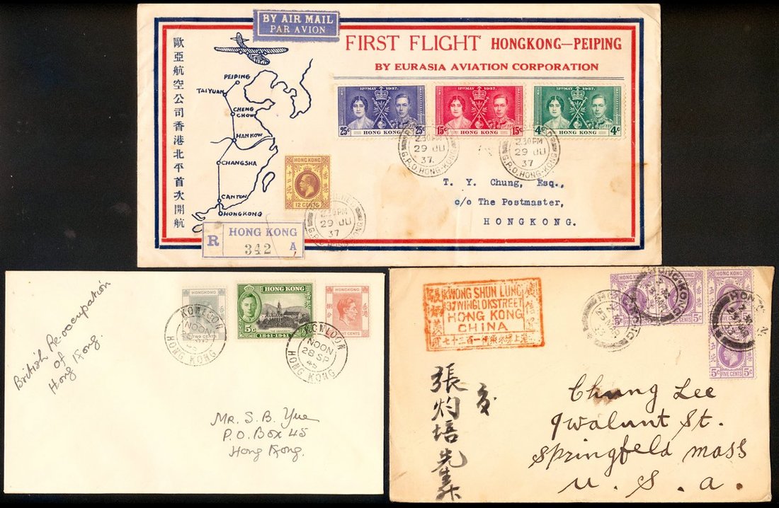1933 (23 Mar.) -1945 (28 Sept.) a small group of three covers, included 1933 to U.S.A. cover; 1937 Hong Kong-Peiping First Flight cover with full set of Coronation Issues; 1945 to Hong Kong local cover.