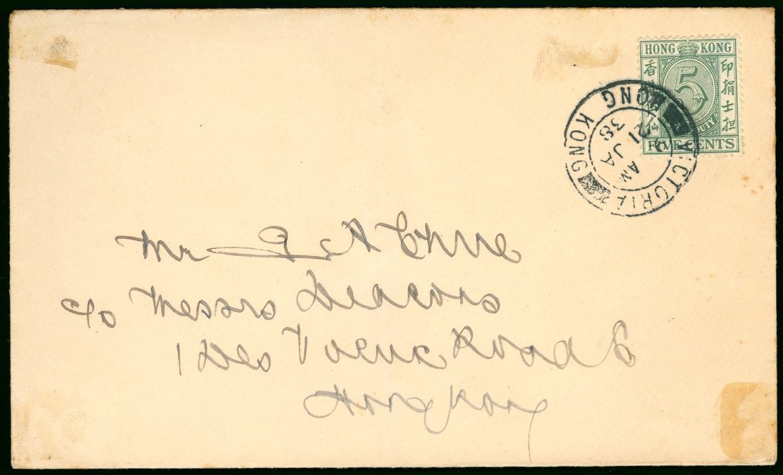 1938 (21 Jan.) to local cover, bearing Hong Kong stamp 5c with Hong Kong c.d.s. This stamp was allowed for postage stamp usage from 11th to 20th Jan. 1938. On the 21st Jan. usually only the 7 am postmark is seen, because it is put into the postbox on the 20th night, and the cover is taken out on the morning of the 21st with 7 am postmark. The cover will be treated as arrears if the cover is posted after 7 am on the 21st. So this cover is rare.