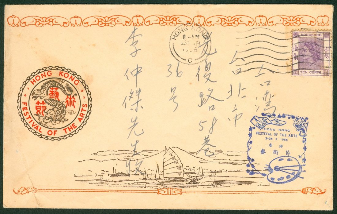 1956 (25 Mar.) F.D.C. of "Hong Kong Festival of the Arts" ( design by The China Philatelic Association H.k.) to Taiwan. Bearing Hong Kong 10c with c.d.s., On the reverse with Taipei Promotional machine postmark.