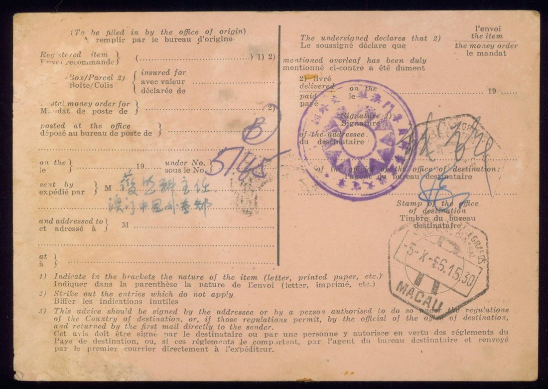 1956 (Oct.) Hong Kong to Macao postal advice card. missing postal stamp, on the reverse with Macao arrival c.d.s. (5.10)