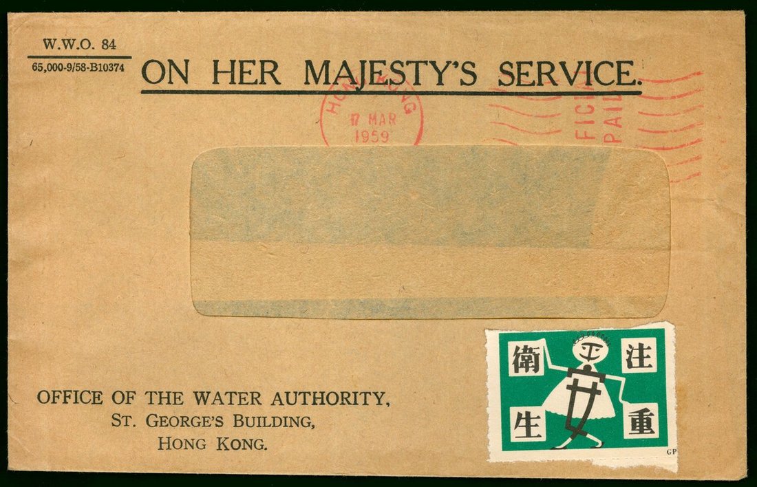 1959 (17 Mar.) Hong Kong Government Official Envelope, with paid machine postmark in red. A sticker of [Pay attention to hygiene "Miss Peace" ] sticker on the bottom.