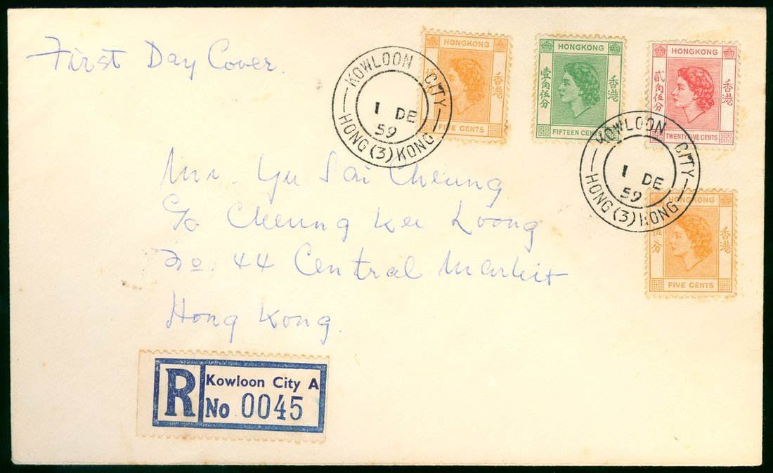 1959 (1 Dec.) a opening Kowloon City post office first day registered cover to local bearing 5c.(2), 15c. and 25c. tied by Kowloon City, showing registered label, very fine.