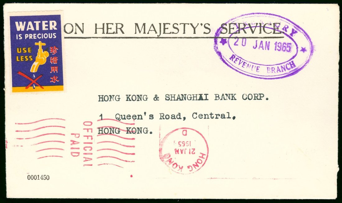 1965 (21 Jan.) Hong Kong Government Official Envelope, with paid machine postmark in red. on the upper left corner with "Water is Precious / Use Less" sticker.