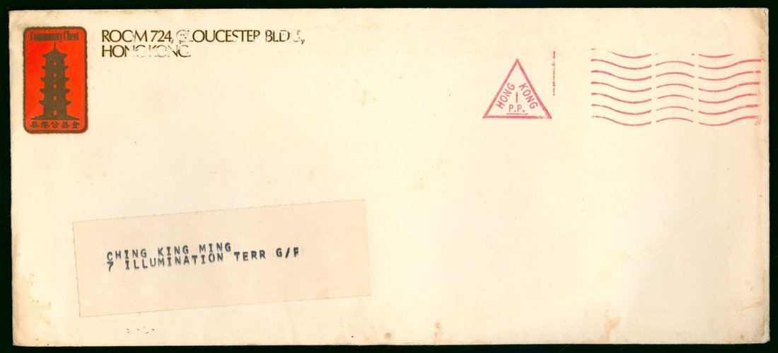 1970s Official cover of The Community Chest of Hong Kong sent to local, with machine triangle "Hong Kong / P.P." postmark in red. Rare.