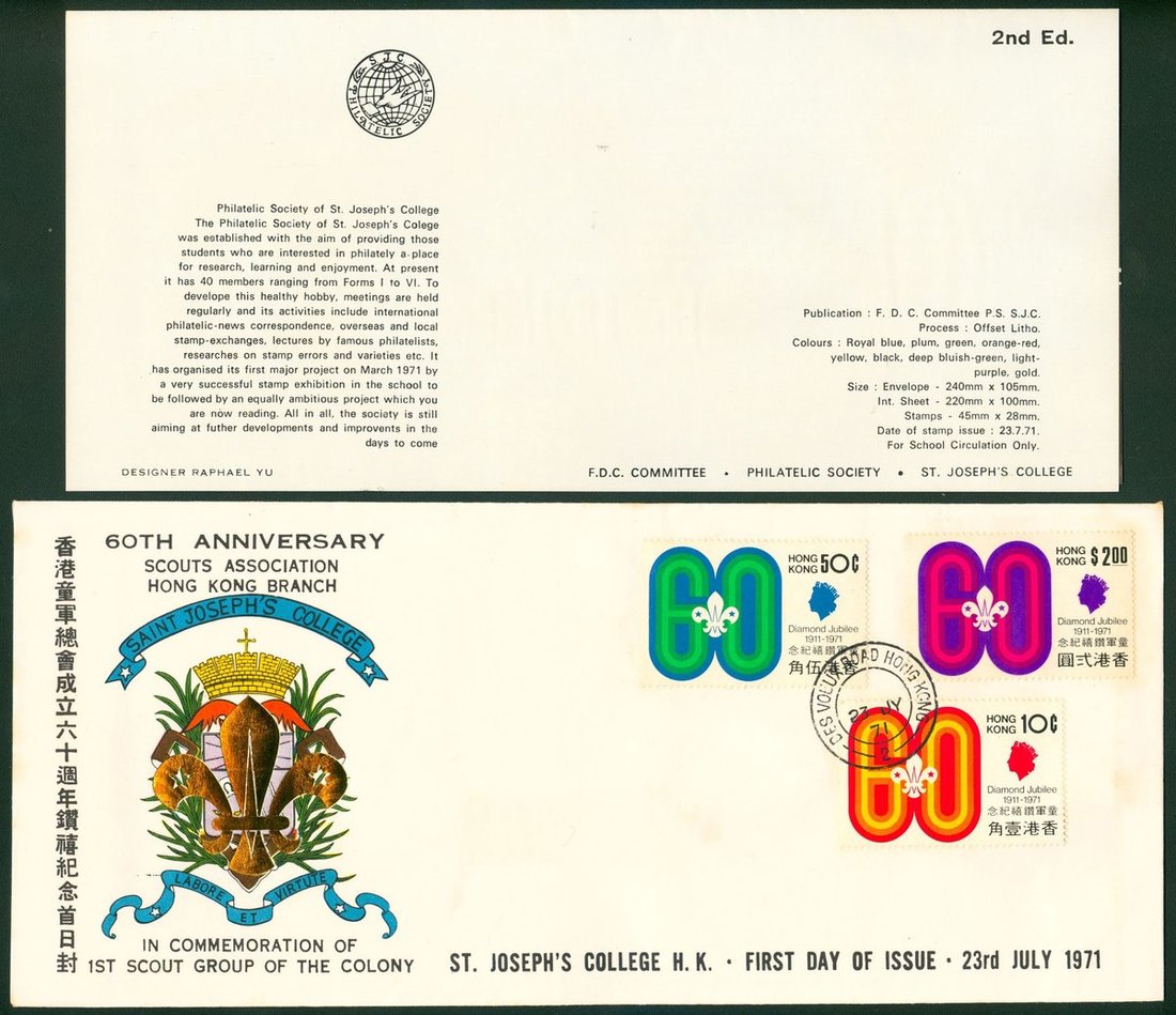 1971 (23 July) F.D.C. of Diamond Jubilee Scouting. The cover is from St. Joseph's College H.k. with Instruction leaflet.