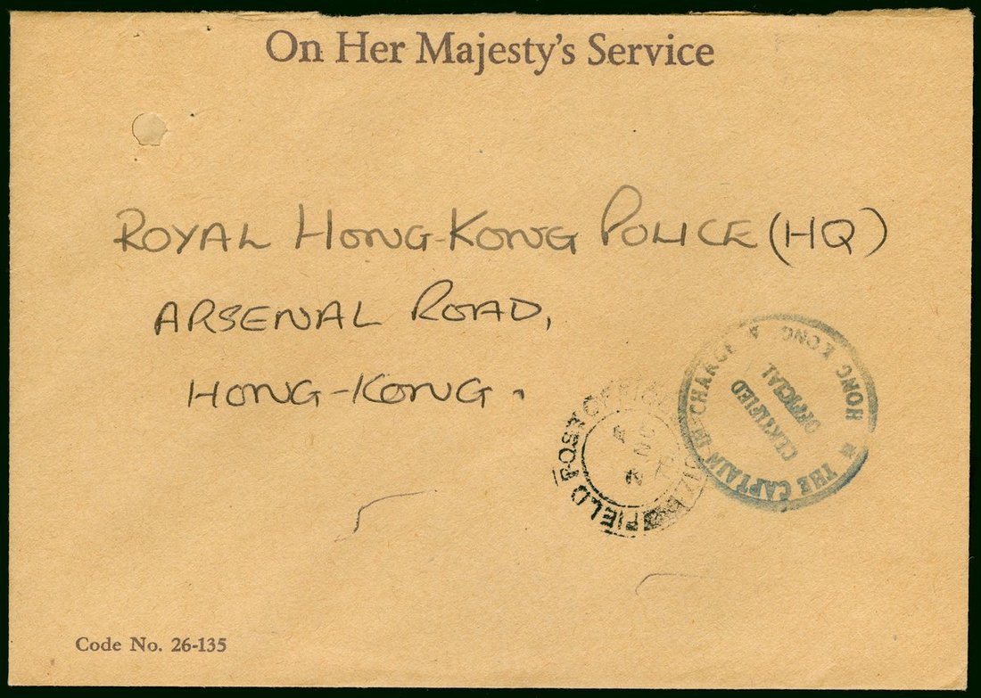 1976 (2 Nov.) a Field Post envelope to Royal H.K. Police (HQ) cancelled Field Post Office No. 710, showing ' The Captain In Charge/ Hong Kong/Certified Official' large ring chop, very fine.