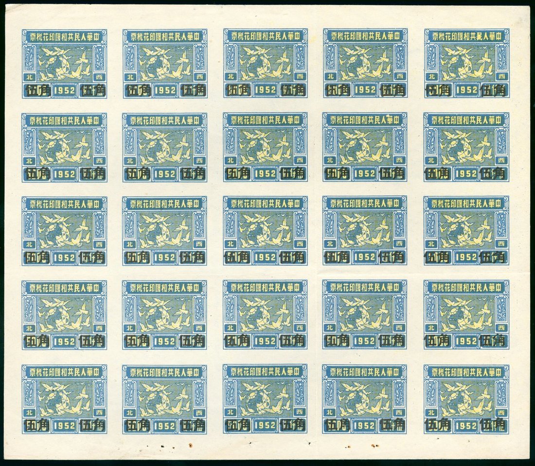 1955年西北區鴿球圖加蓋改值伍角(加蓋左讀)無齒印花稅票新票25枚全張1件,票間有縱橫各一道折痕,票面顏色鮮豔,保存完好,少見