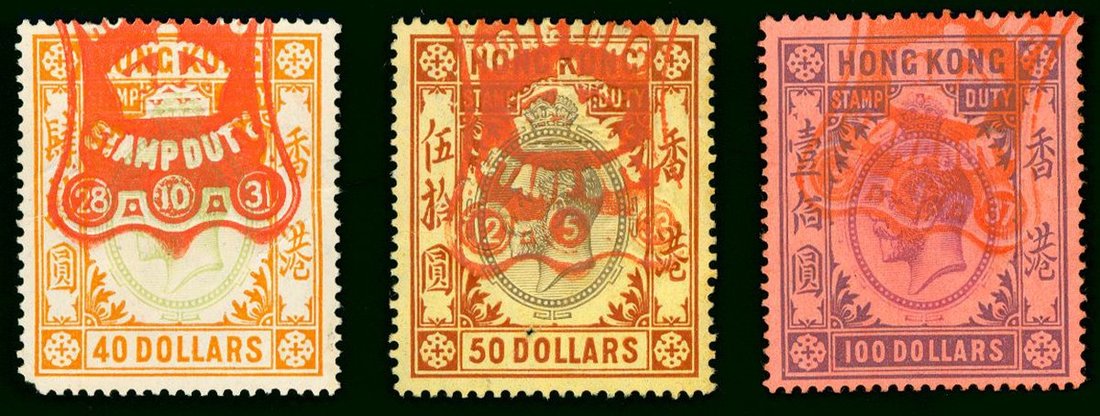 1912-1921 K.G.V. Stamp Duty watermark multiple crown script CA $40, $50 and $100 cancelled by embossed seals, fine.