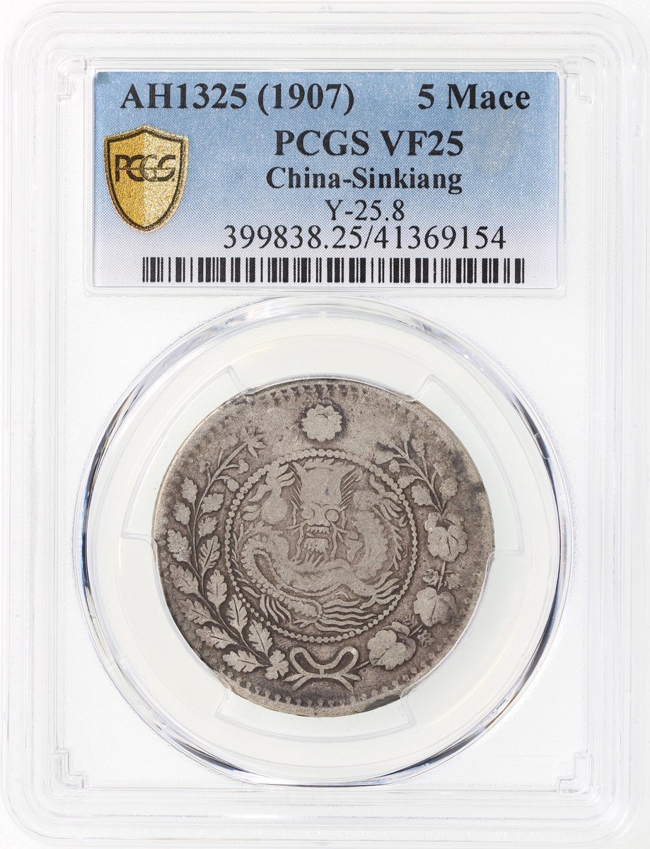 Sinkiang Province, silver 5 mace, AH1325(1907), Kashgar, dragon on obverse, (Y-25.8), toned, PCGS VF 25.