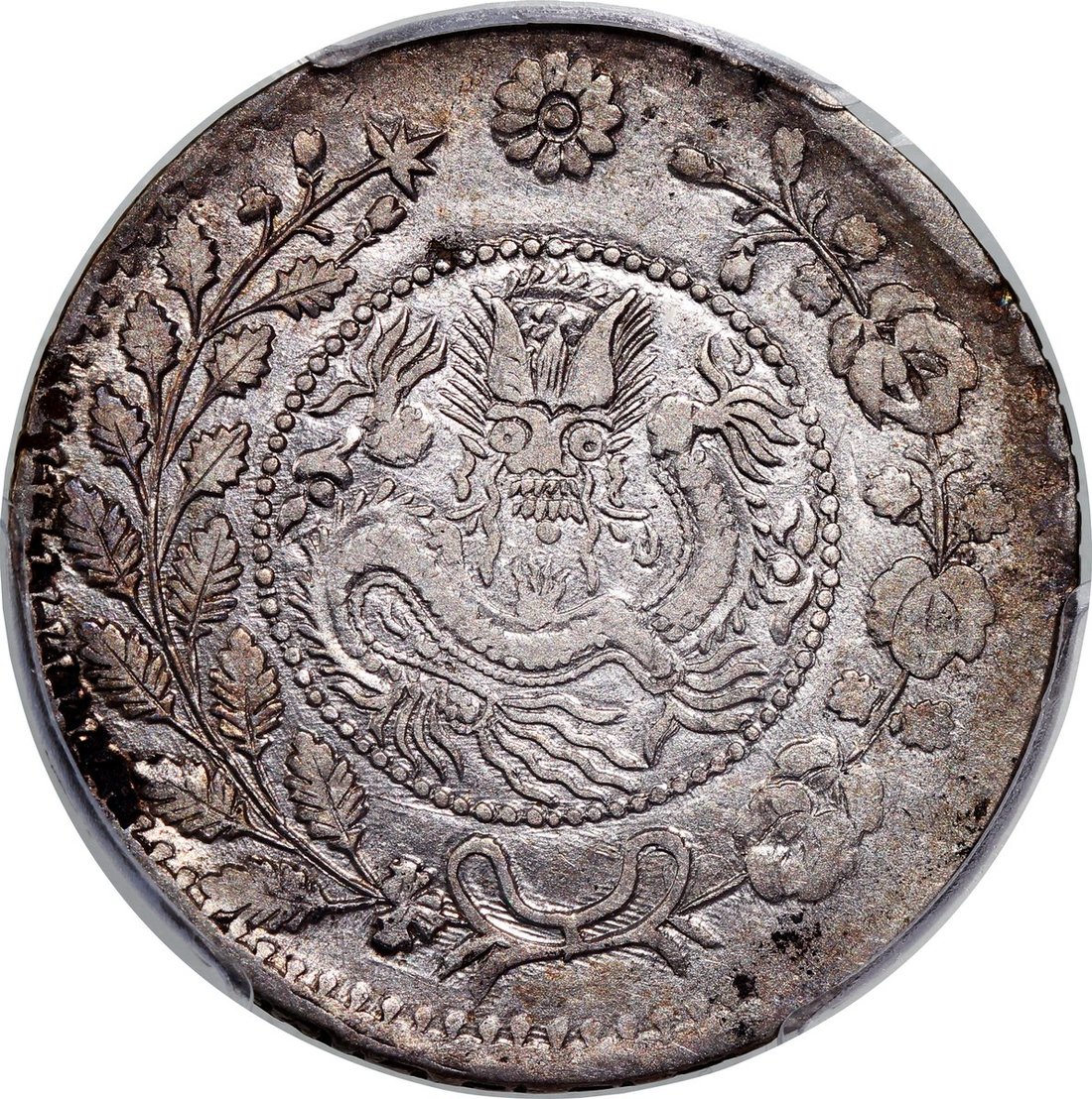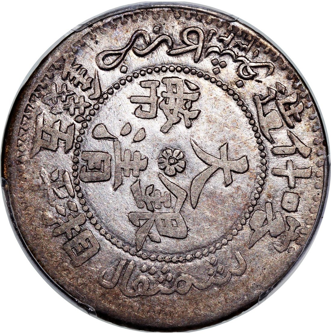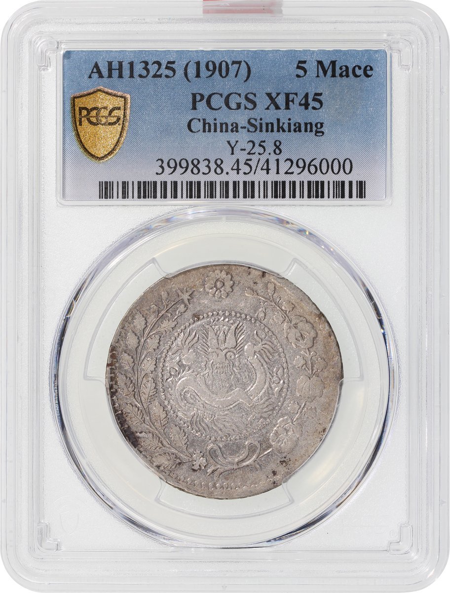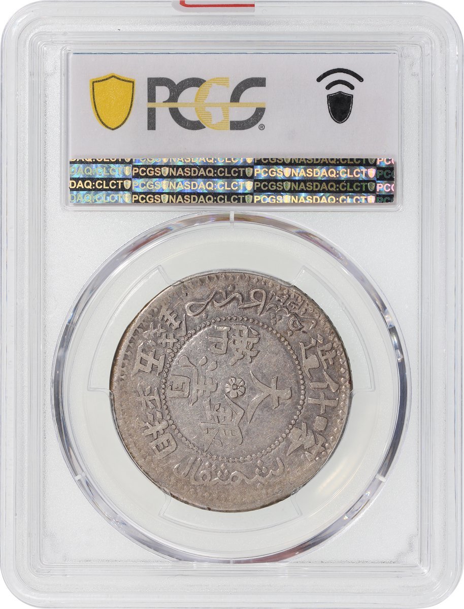 1907年新疆喀什大清銀幣湘平五錢,PCGS XF 45,背面鑄打轉移