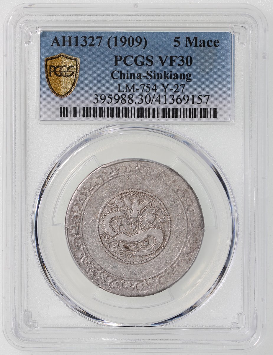 Sinkiang Province, silver 5 mace, AH1327(1909), Kashgar, Xuantong Yinbi, dragon on obverse, (LM-754), PCGS VF 30.