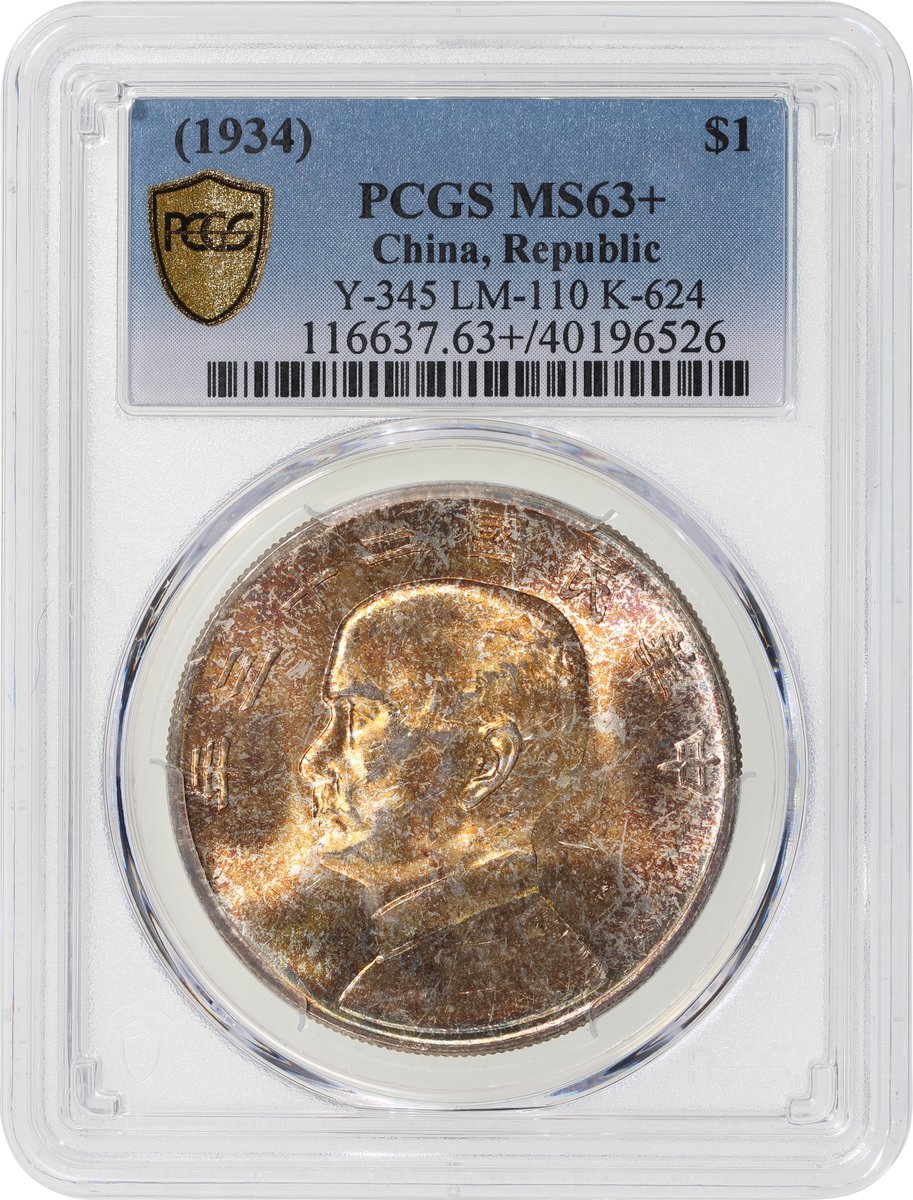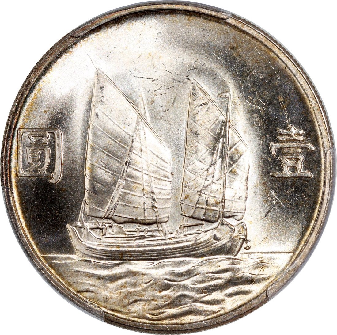 民國二十三年孫中山像帆船壹圓銀幣,正面有明顯金黃包漿,PCGS MS63+