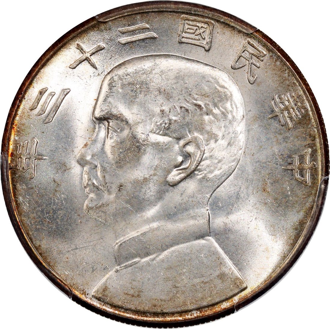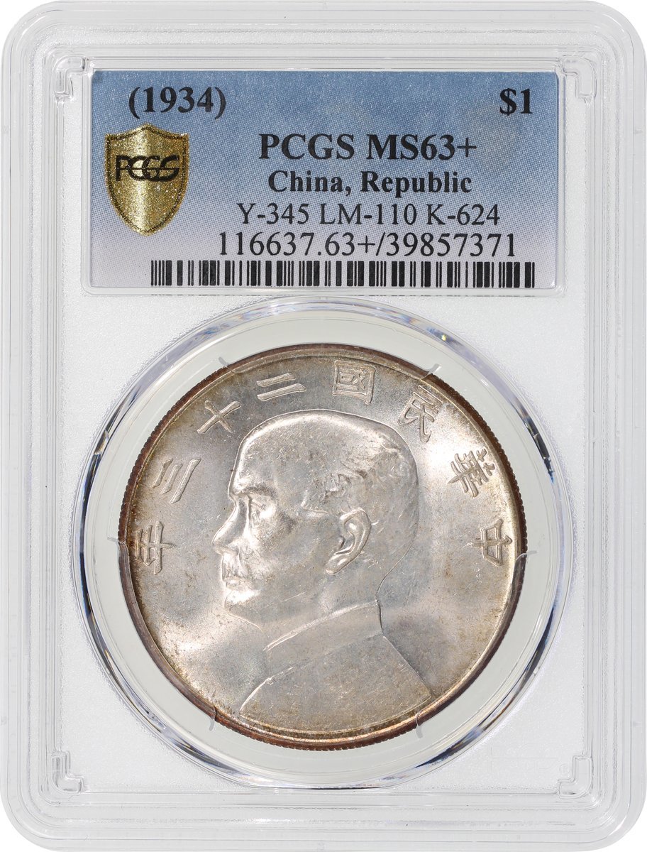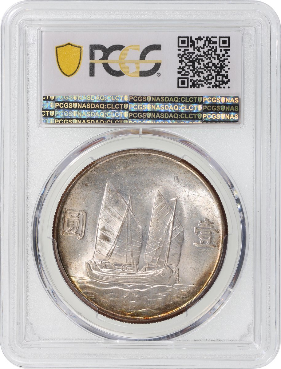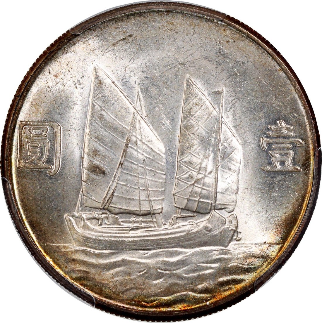 民國二十三年孫中山像帆船壹圓銀幣,幣邊有輕微包漿,PCGS MS63+