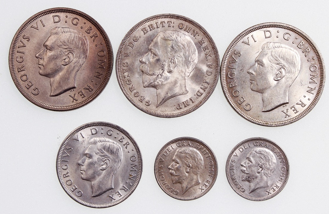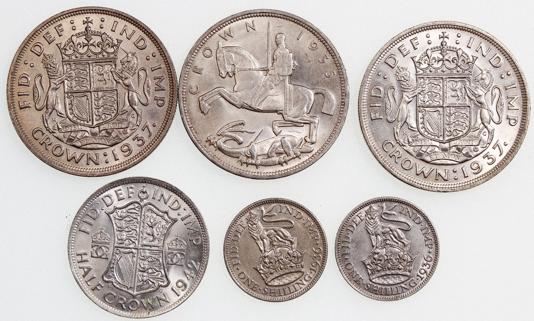 英國一組6枚,包括1936年1先令2枚,1942年半克朗,1935及1937年1克朗,近乎UNC品相