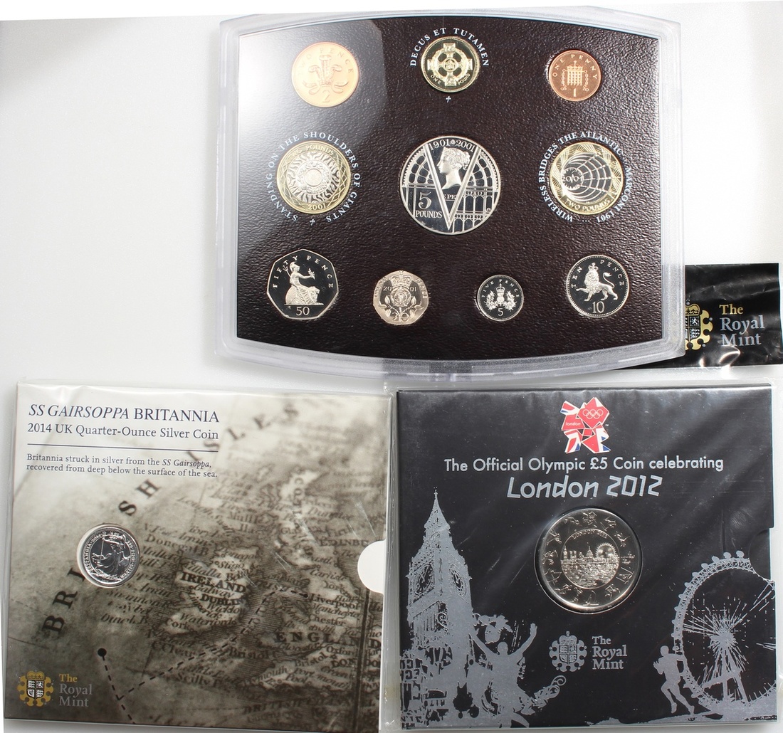 Great Britain, 3 sets of commemorative issues, consisting of: proof coin set, 1 penny to £5, 2001, copper nickel £5, 2012, commemorative issue for the London Olympics, and silver 50p, 2014, commemorative issue struck in silder from the SS Gairsoppa, weighs 1/4oz,