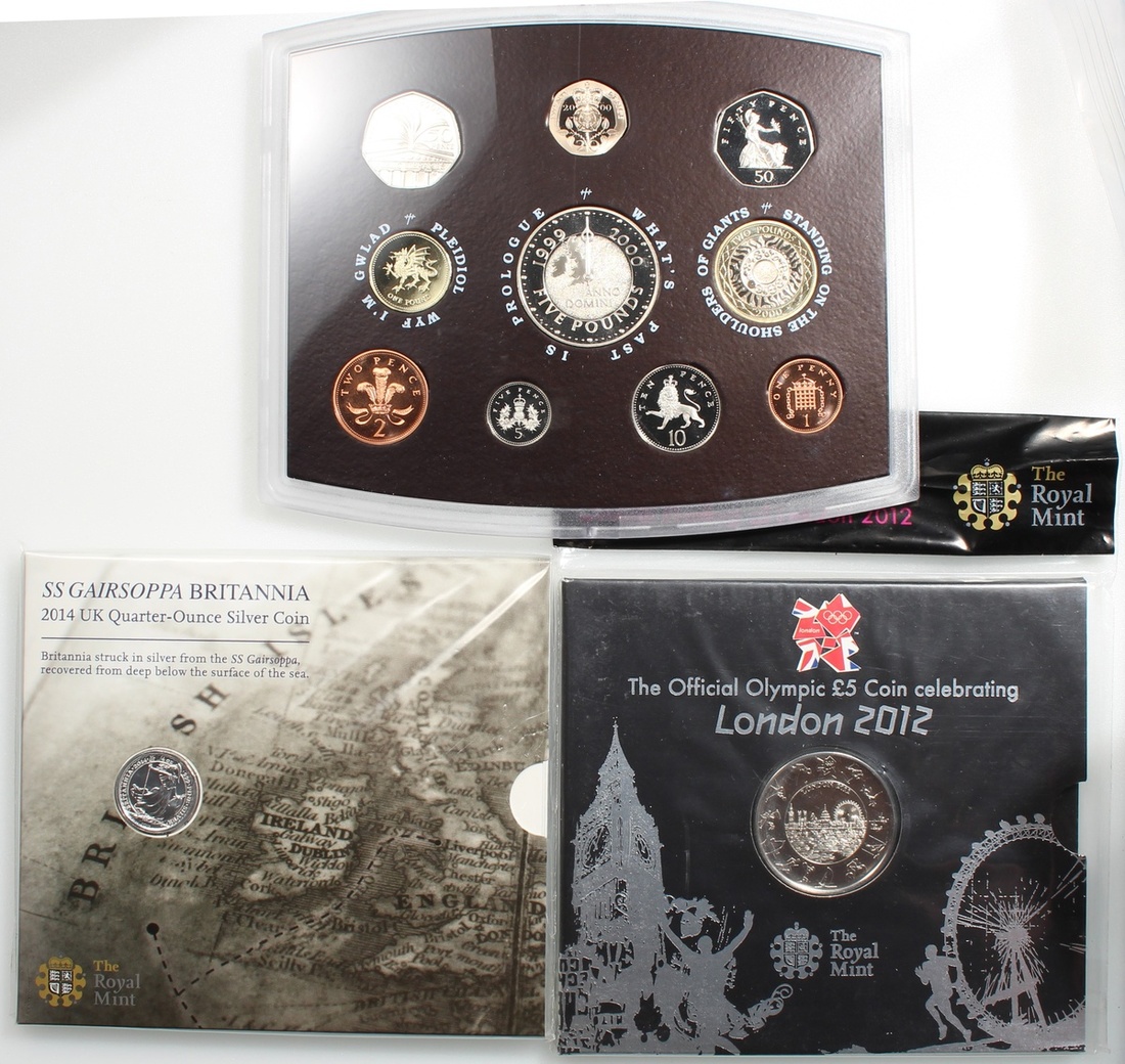 Great Britain, 3 sets of commemorative issues, consisting of: proof coin set, 1 penny to £5, 2000, copper nickel £5, 2012, commemorative issue for the London Olympics, and silver 50p, 2014, commemorative issue struck in silver from the SS Gairsoppa, weighs 1/4oz,