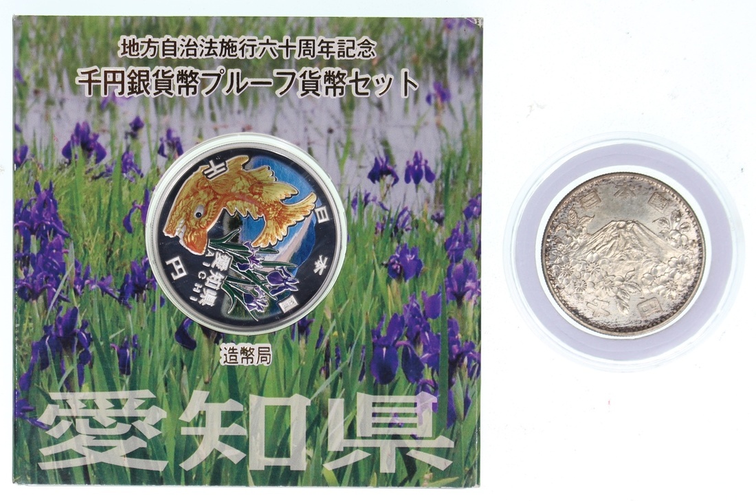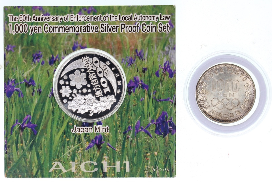 1964年日本東京奧運紀念銀幣1000元,及2010年愛知縣地方自治法施行六十週年精鑄銀幣1000元,分別UNC及proof FDC