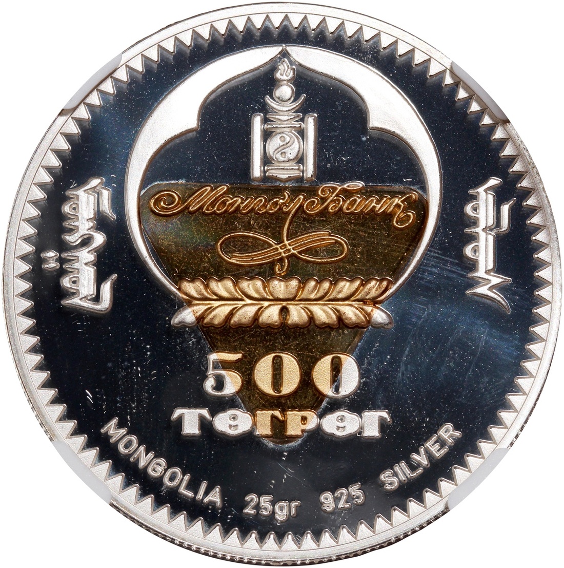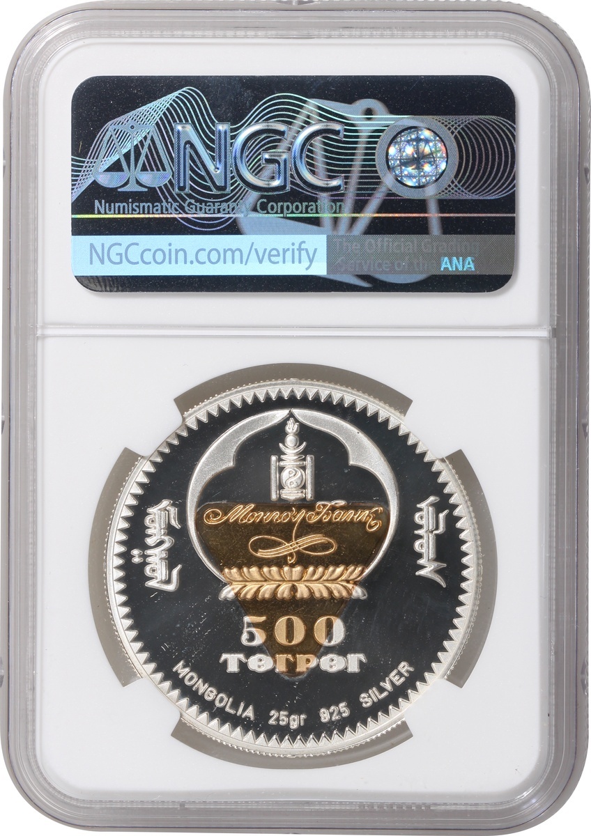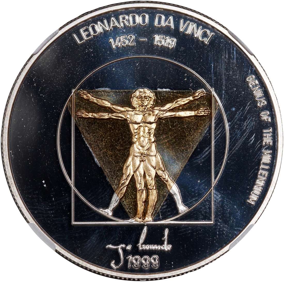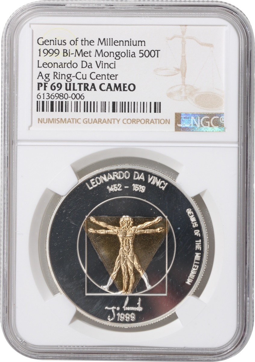 1999年蒙古「千古天才系列」500圖格里克雙金屬幣,達文西像,重25克含.925銀,含銀量0.76安士,NGC PF69 Ultra Cameo,編號6136980-006