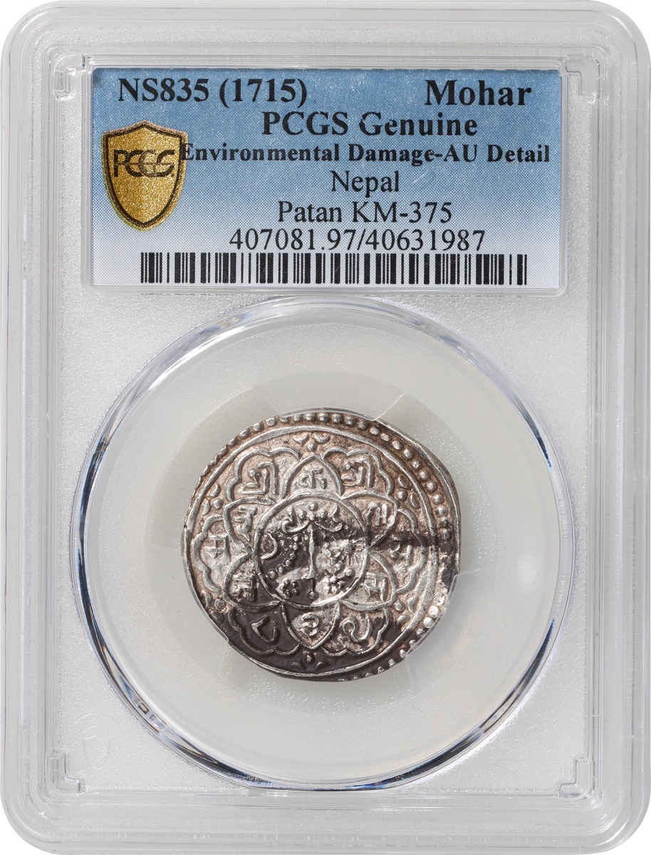 Nepal, Kingdom of Patan, silver mohar, NS835 (1715), (KM-375), PCGS Genuine Environmental Damage - AU Detail, #40631987.