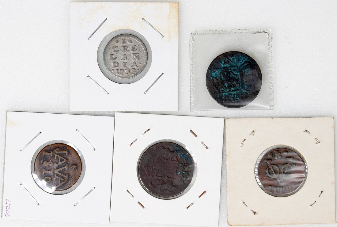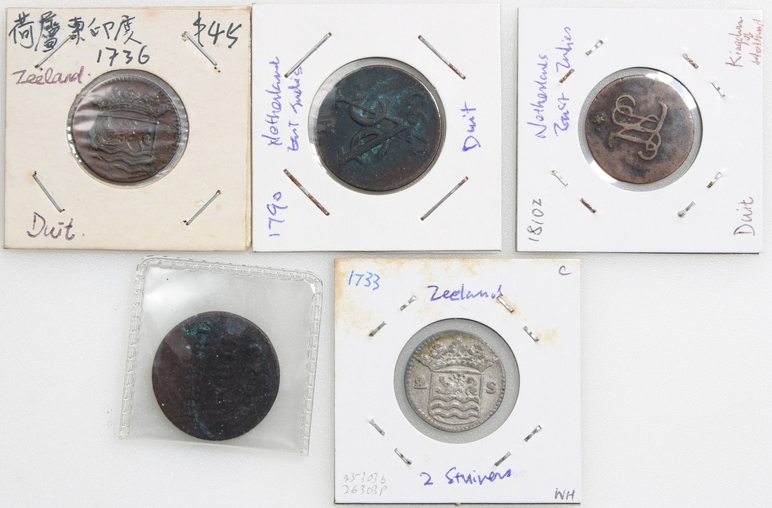 荷屬東印度一組5枚,包括1736, 1790 及1810年1兌銅幣共3枚,1823年1/2斯圖弗銅幣,及1733年2斯圖弗銀幣,GVF品相,建議預覽