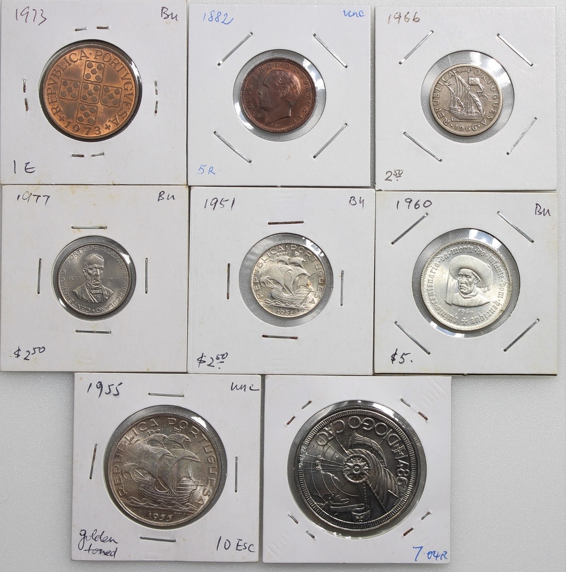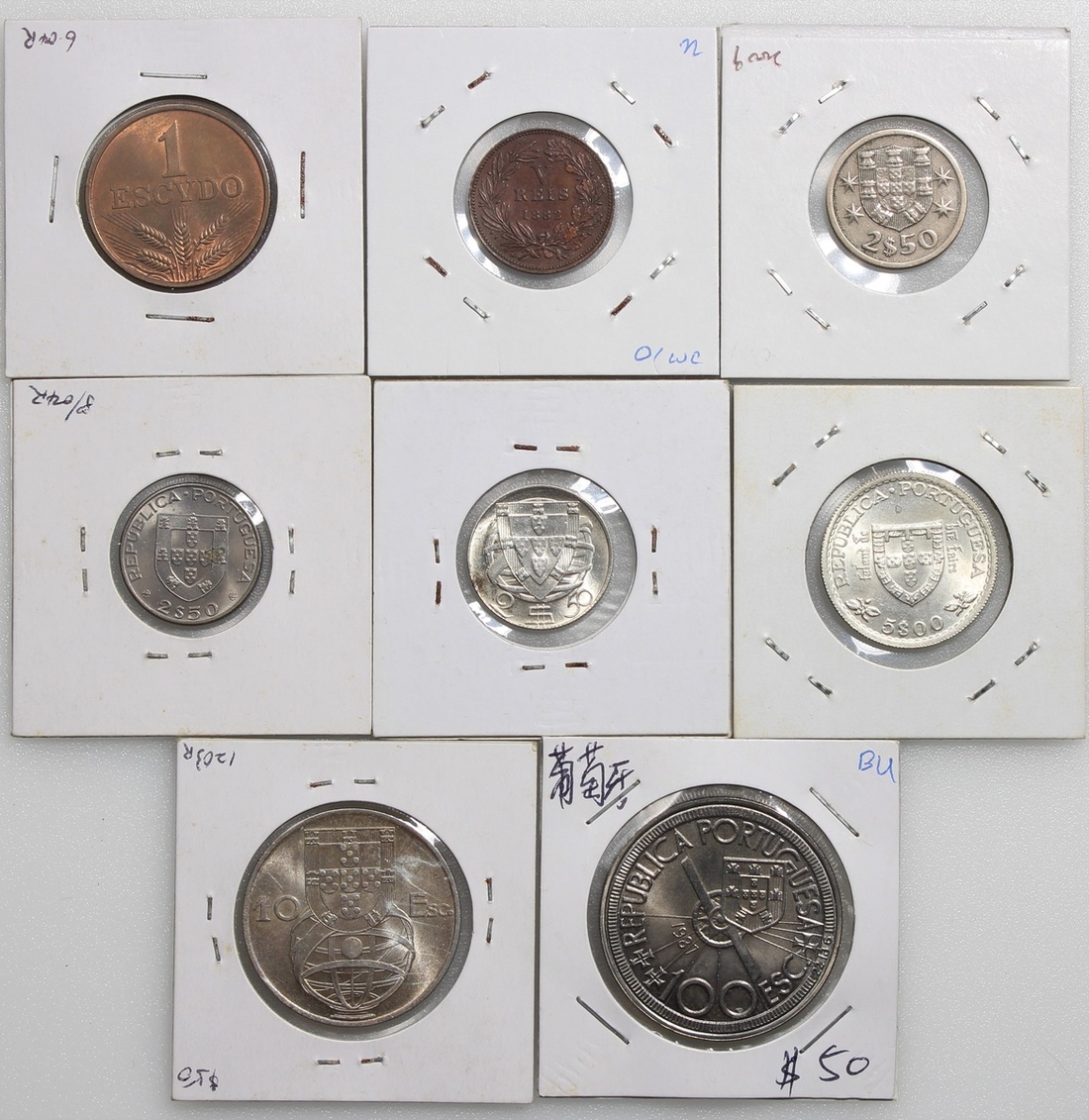 葡萄牙錢幣一組8枚,包括1882年5雷亞爾銅幣,1973年1埃斯庫多,1966及97年2.5埃斯庫多,1951及60年5埃斯庫多,1955年10埃斯庫多,及1987年100埃斯庫多,大多UNC品相
