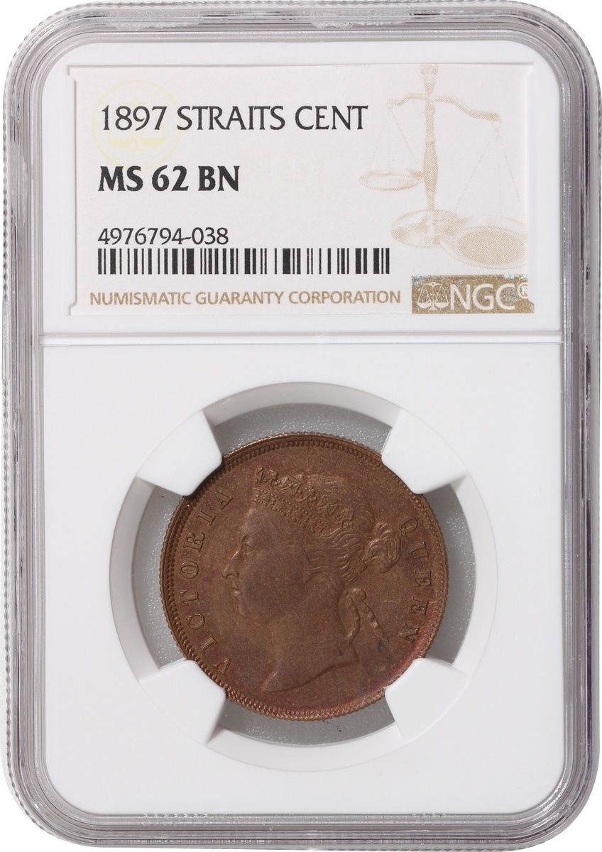 1897年海峽殖民地1仙銅幣,NGC MS62BN,編號4976794-038