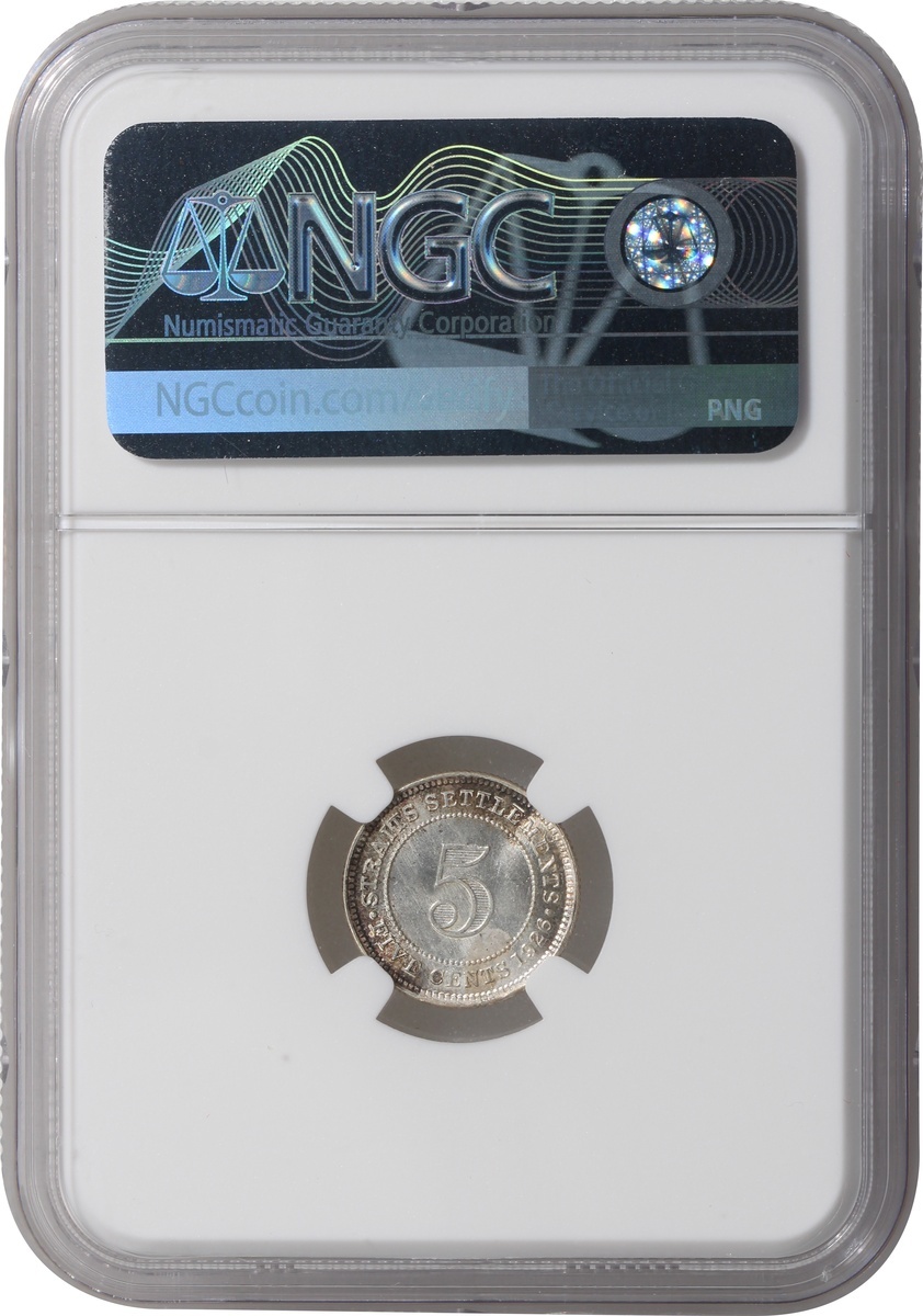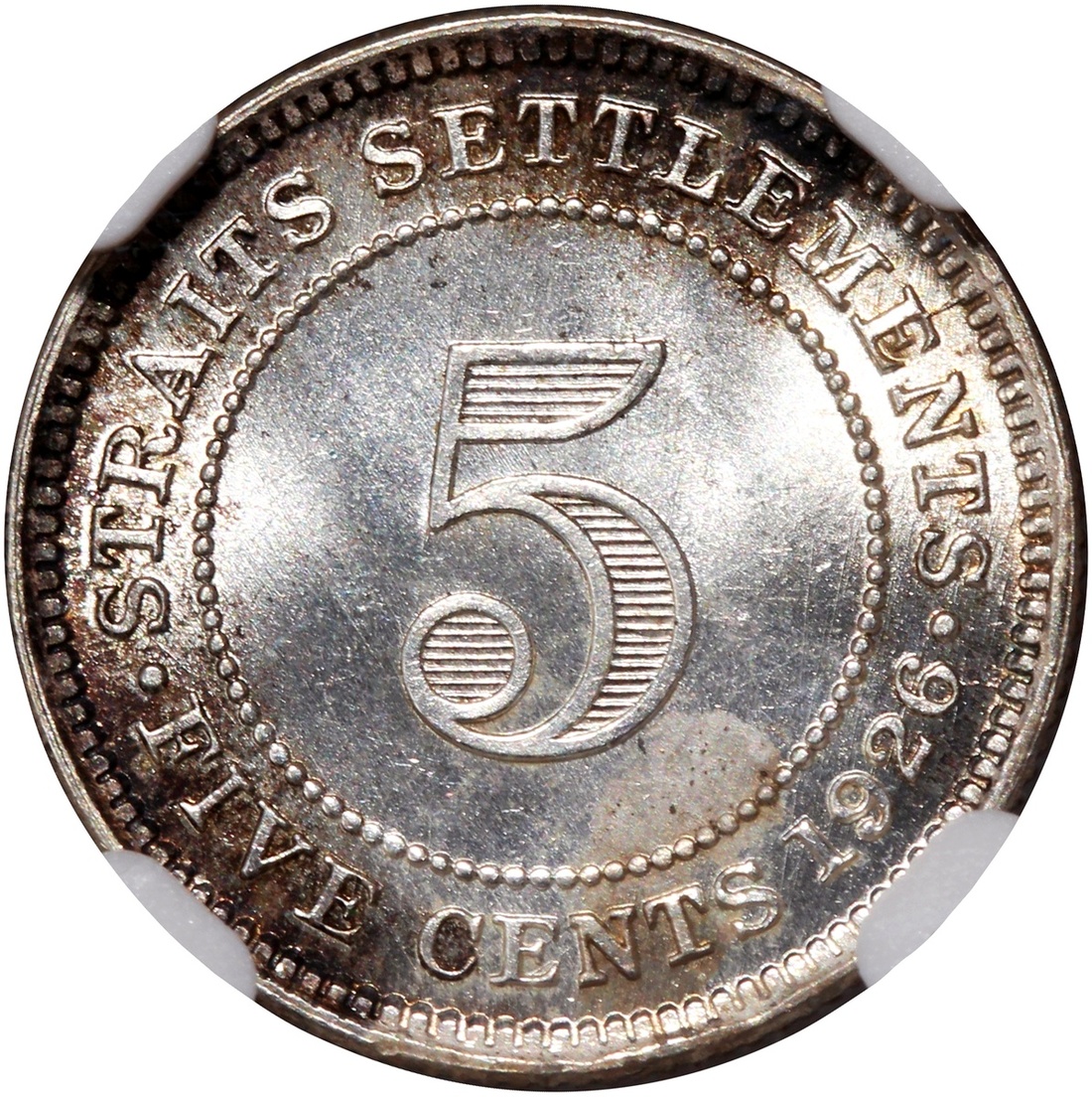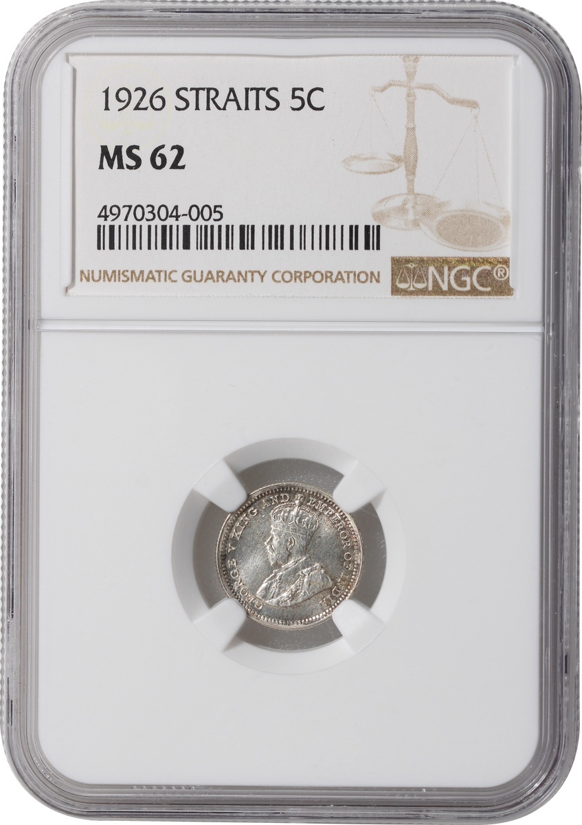 1918及1926年海峽殖民地5仙銀幣一對,分別評PCGS MS62及NGC MS62,編號80794273及4970304-005