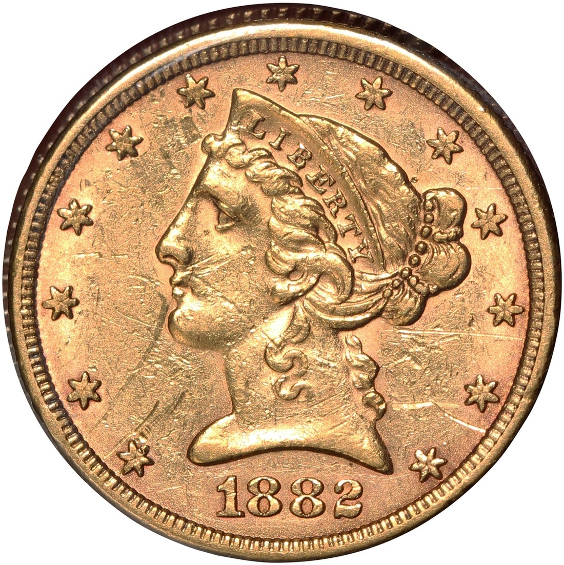1882年美國5角金幣,含金量0.24安士,UNC品相