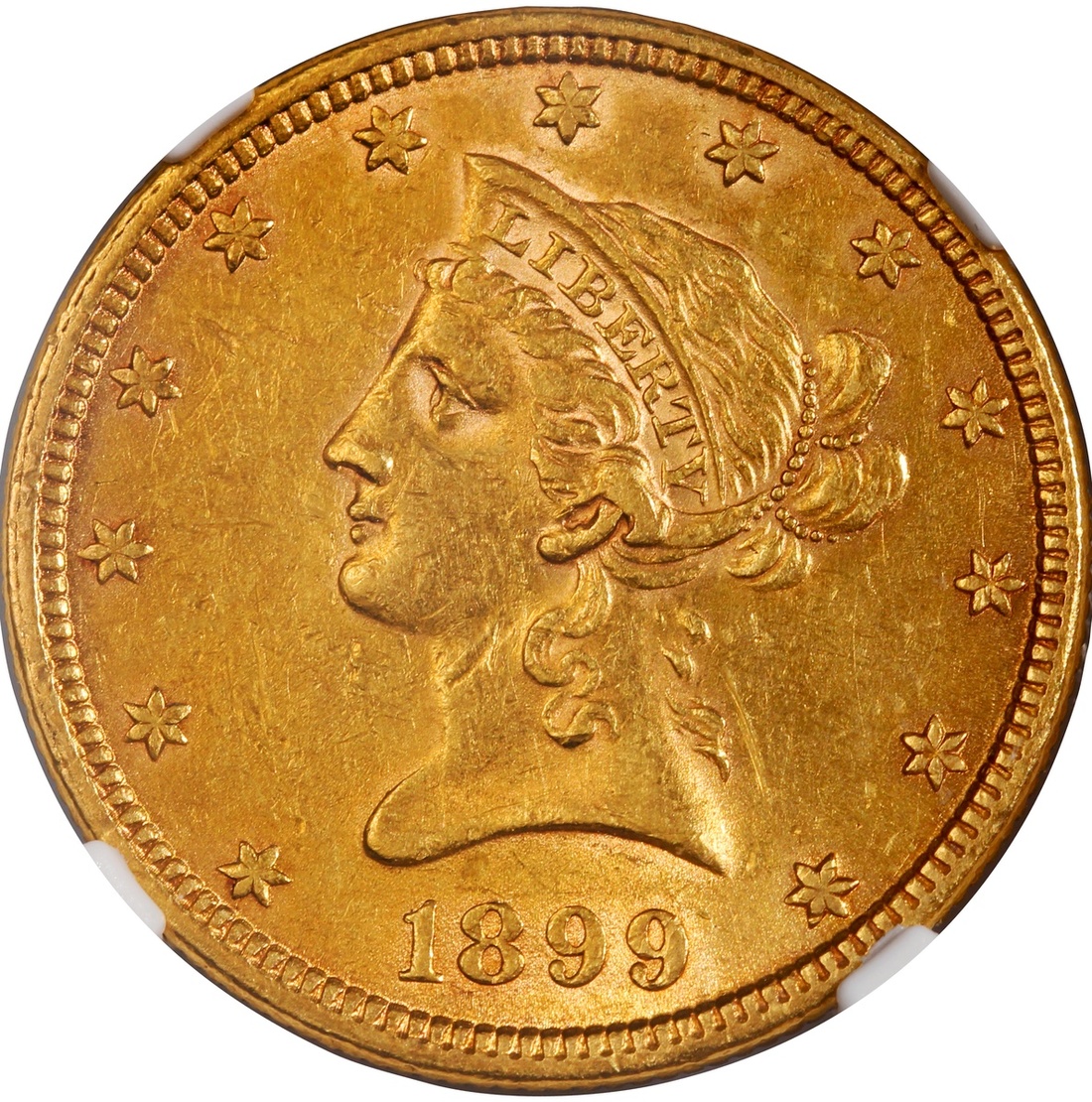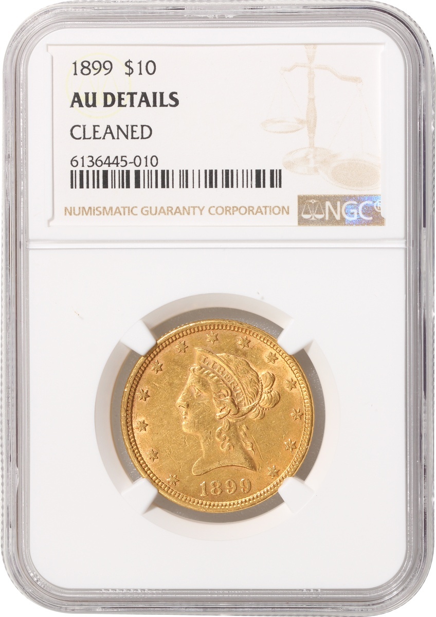 1899年美國10元金幣,重16.7克含.900金,含金量 15.0克 (0.48安士),NGC AU Details (有清洗),編號6136445-010