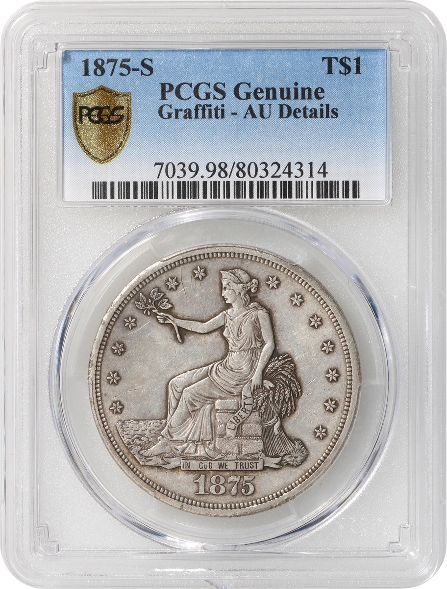 United States, silver $1, 1875-S, trade dollar, PCGS AU Detail, graffiti. #80324314