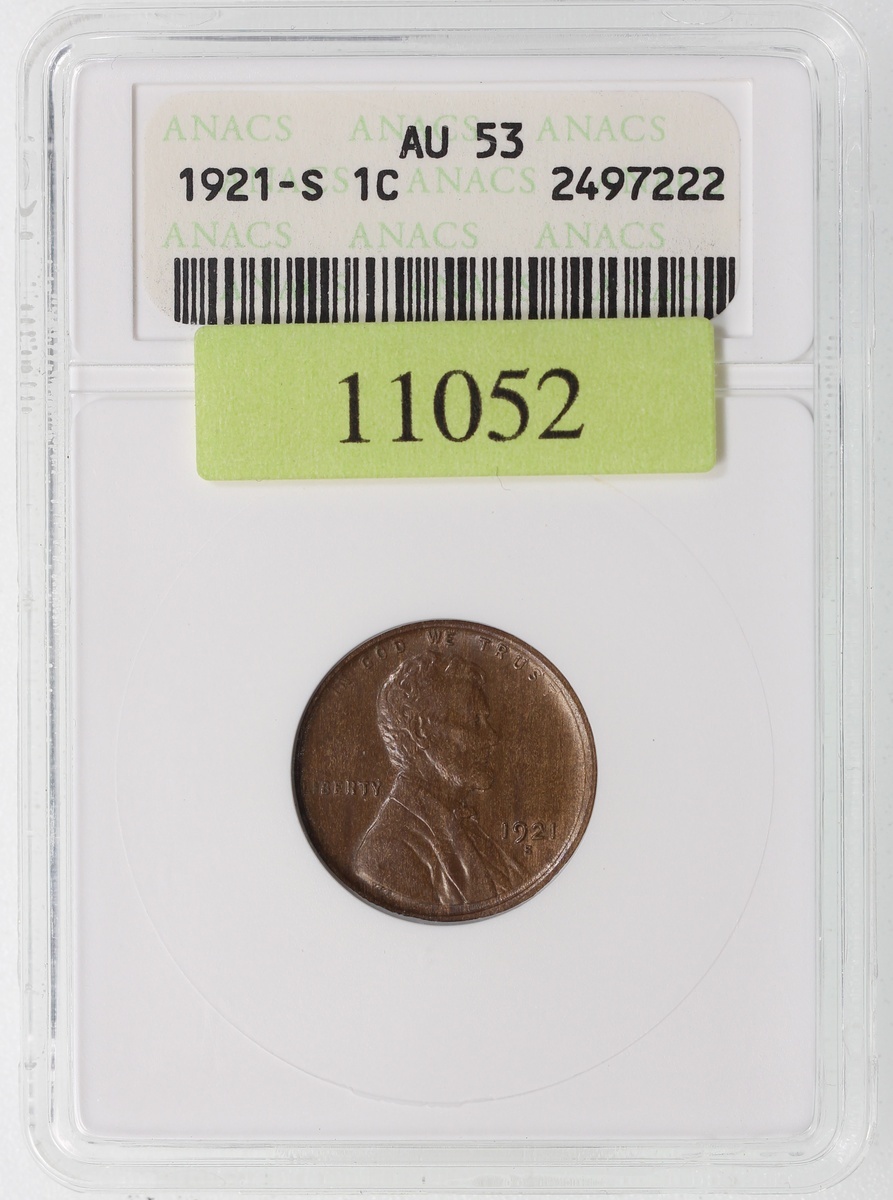 United States, 1 cent, 1921-S and proof 50 cents, 1960, ANACS AU53 and PCGS PR64 respectively (2)
