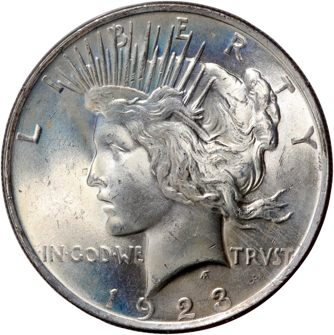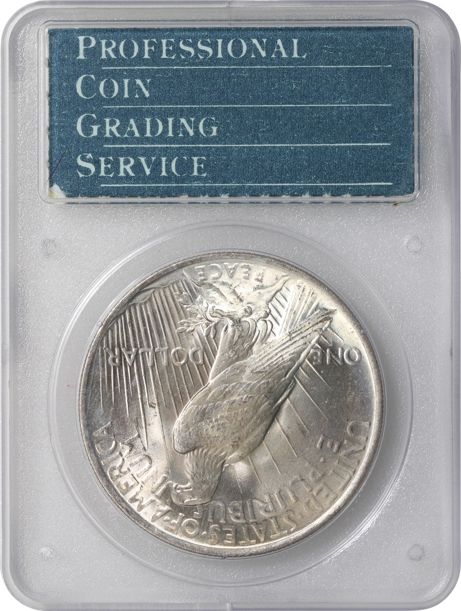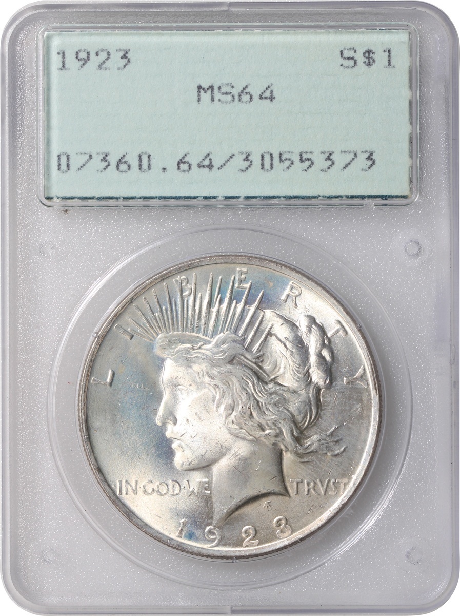 United States, silver 'Peace' dollar, 1923, PCGS MS64. The very first PCGS coin holder and hard to come by.