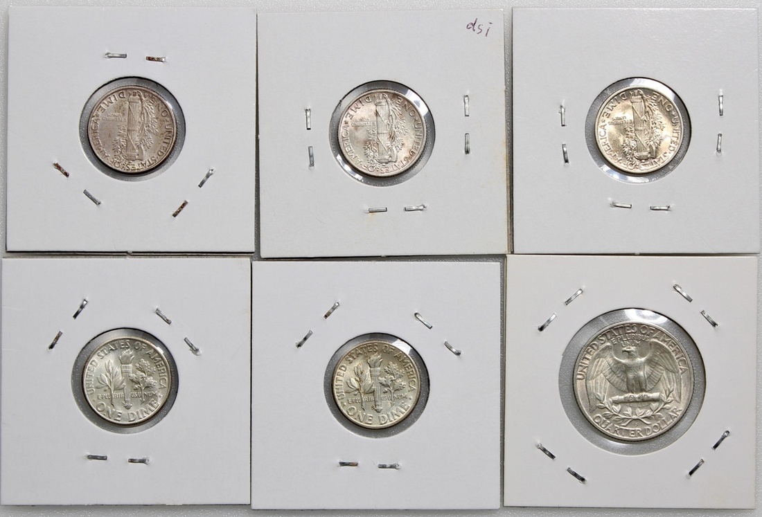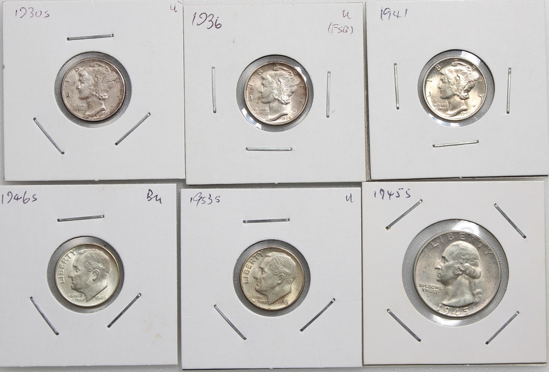 美國錢幣一組6枚,包括1930S,1936,1941,1964S及1953S 1毫銀幣,及1945S 25分銀幣,大致UNC品相