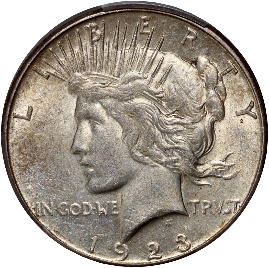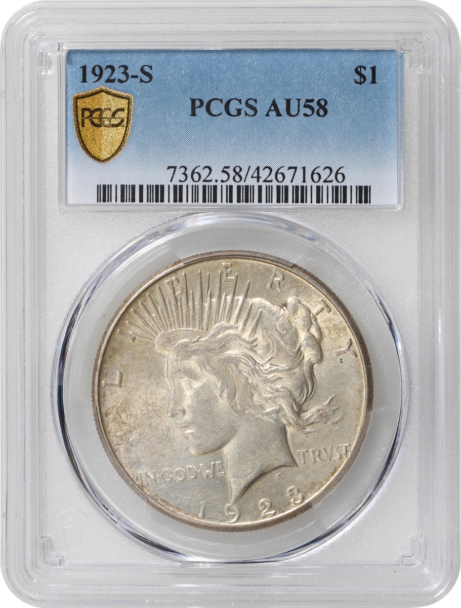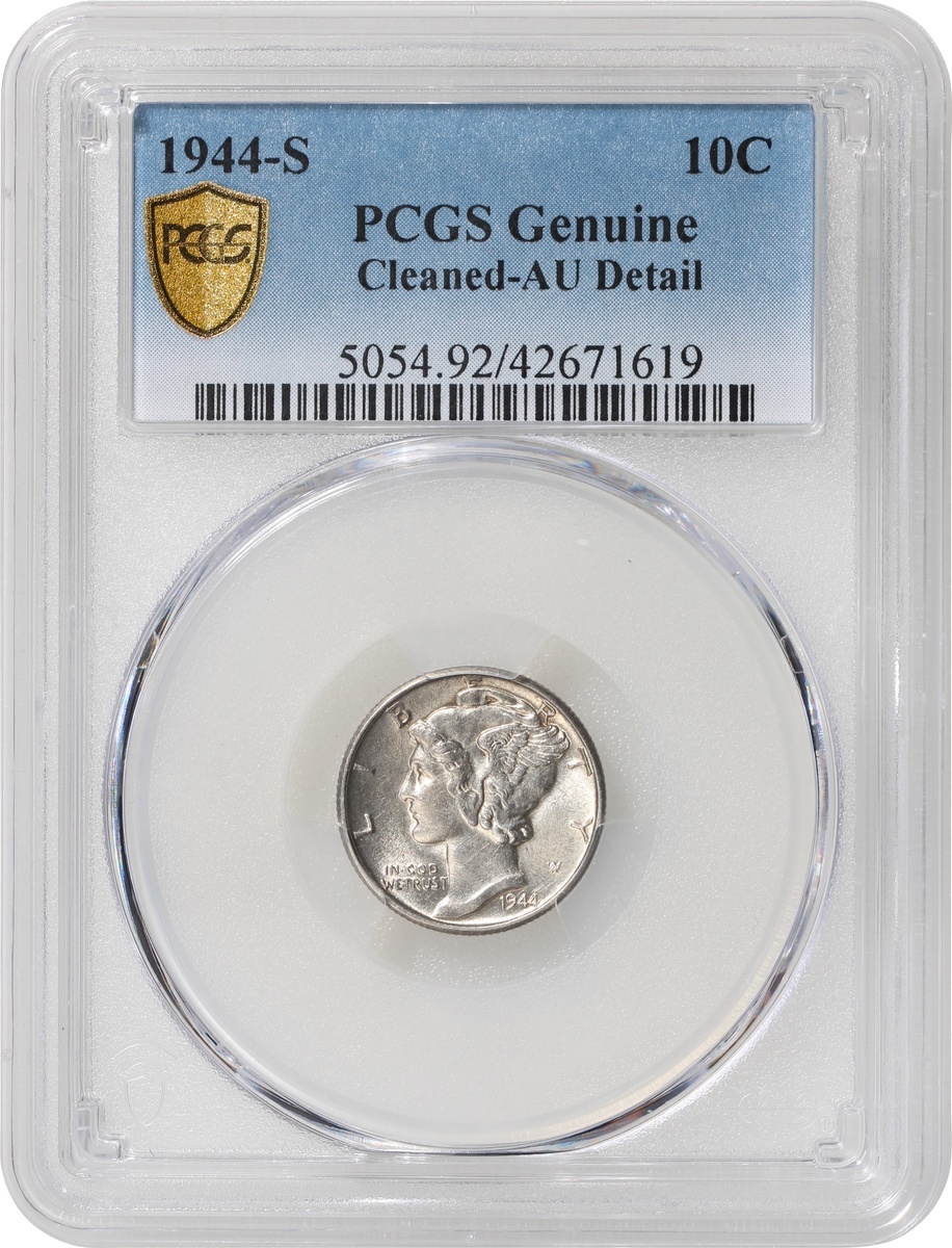 United States, silver dime, 1944-S and 1945, and $1 'Peace' dollar, 1923-S, graded PCGS Genuine Cleaned - AU Detail, MS62 and AU58, #42671619, 42671620 and #42671626 respectively. (3)