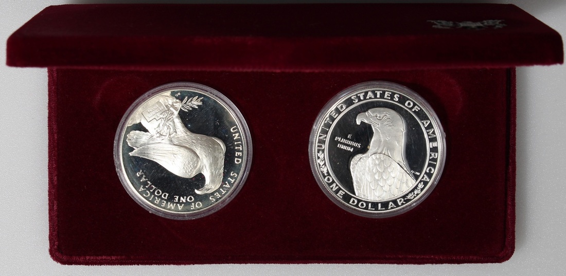 1984年美國洛杉磯奧運紀念1元精鑄銀幣2枚一套,含1.54盎司銀,proof,輕微霧化,連原盒及證書