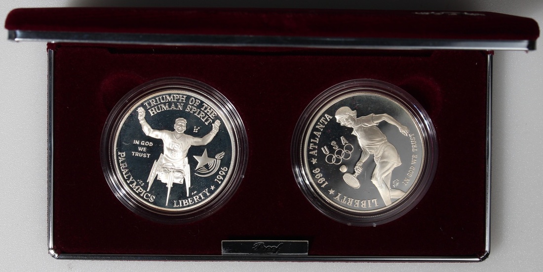 1996年美國亞特蘭大奧運紀念「輪椅選手」及「網球」1元精鑄銀幣2枚一套,含1.52盎司銀,proof,連原盒及證書