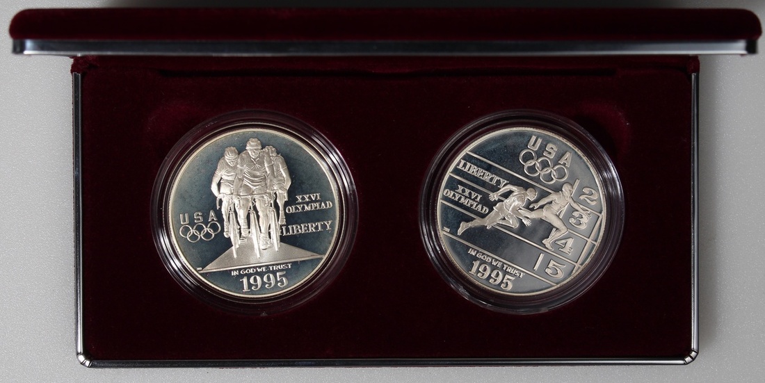 United States Mint, U.S. Olympic Coins of the Atlanta Centennial Olympic Games, two silver proof $1, 'Track Runner' and 'Cyclist', 1995, a total of 1.52oz ASW,