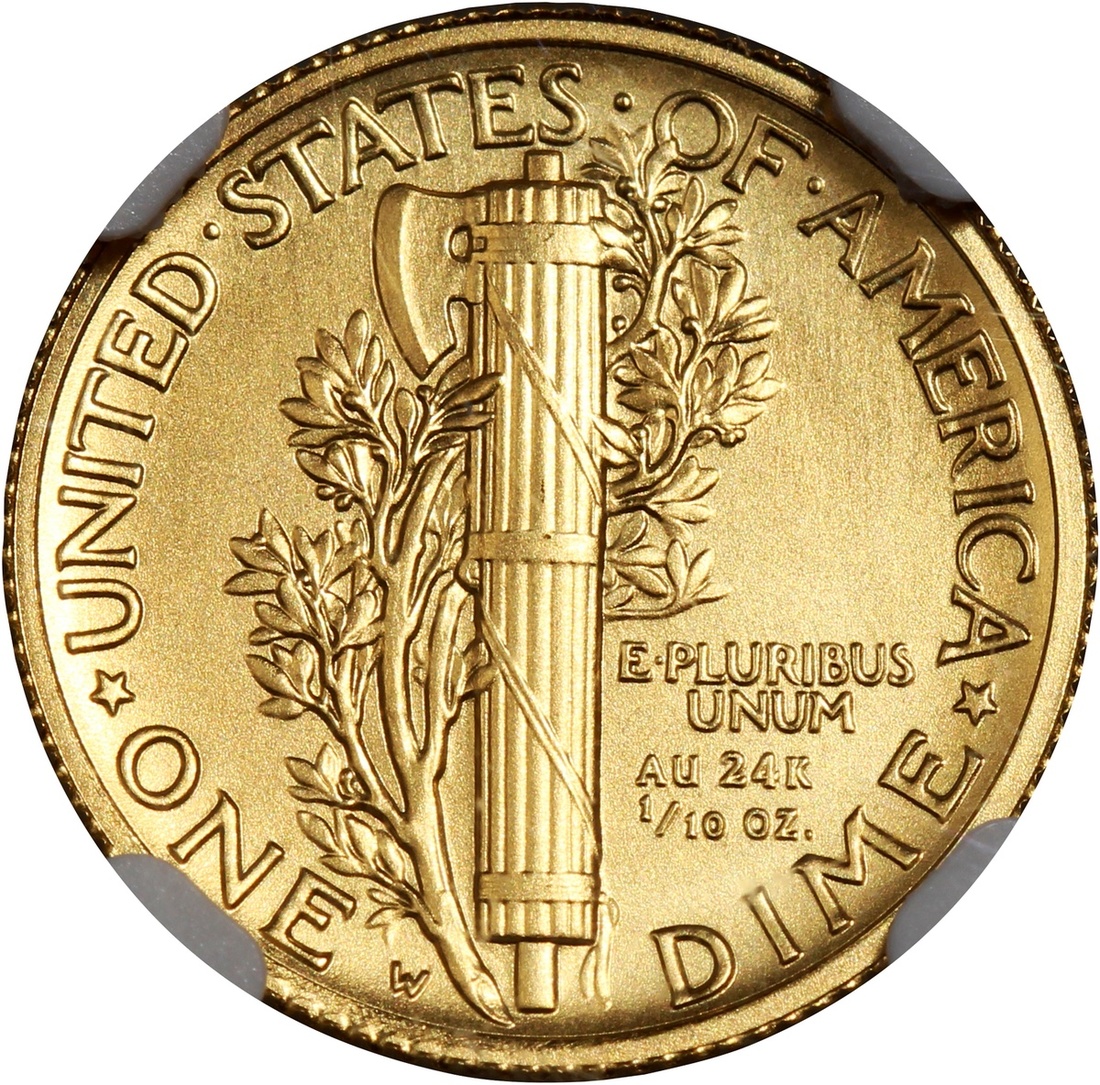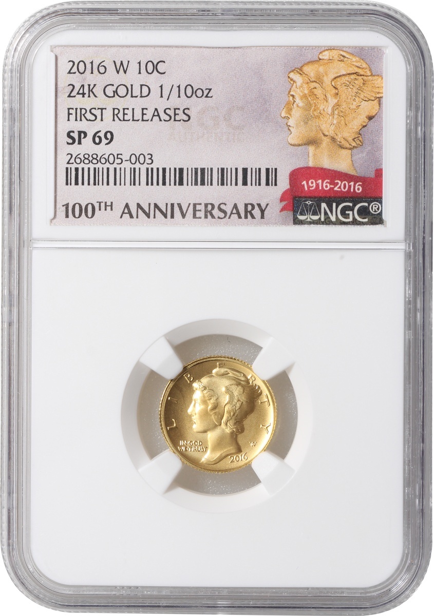 United States, gold 1 dime, 2016W, first releases, 100th anniversary of the first 'Mercury' dime issue, 1/10oz gold AGW,