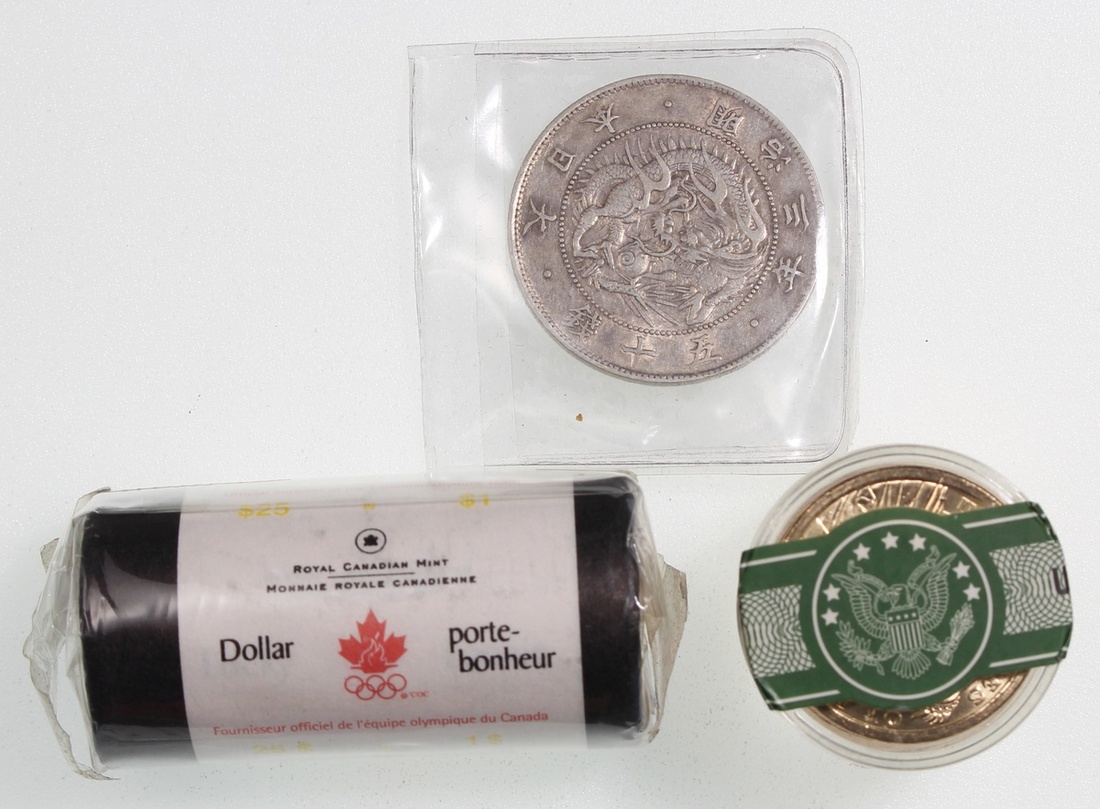 世界錢幣3組,包括美國及加拿大各一筒紀念幣,以及日本明治三年50錢,錢2組UNC各原封一筒,第三枚EF至AU
