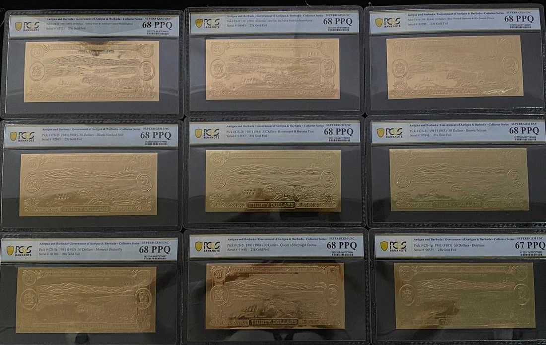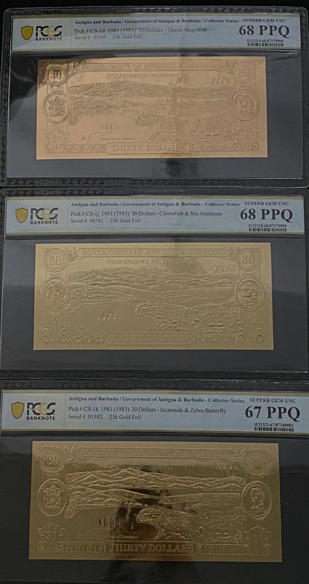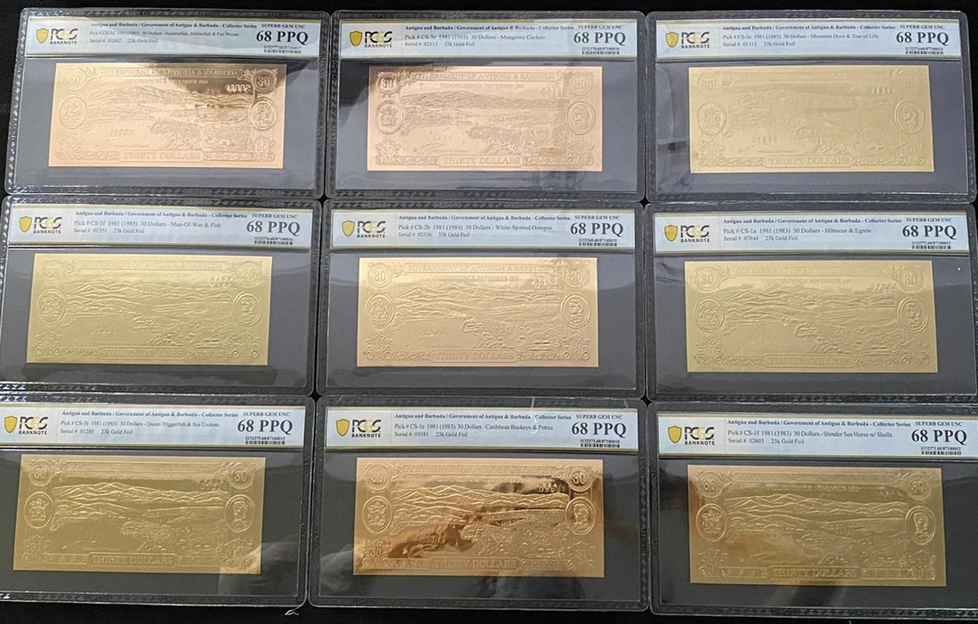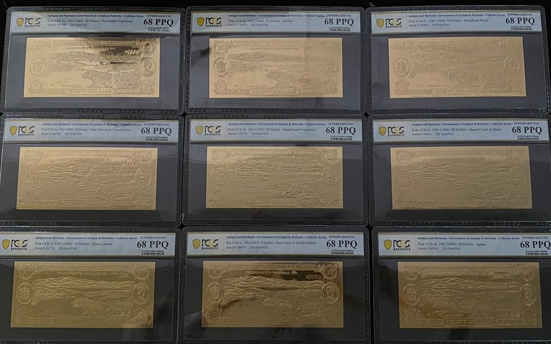 1984年安地卡及巴布達1981年獨立紀念鍍金鈔30元一組30枚,混合編號,PCGS Banknote 67PPQ-68PPQ