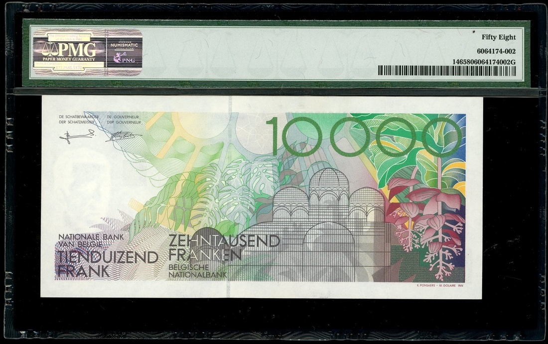 1992-1997年比利時10,000法郎,編號90100370688,PMG 58,少見之最高鈔票面值