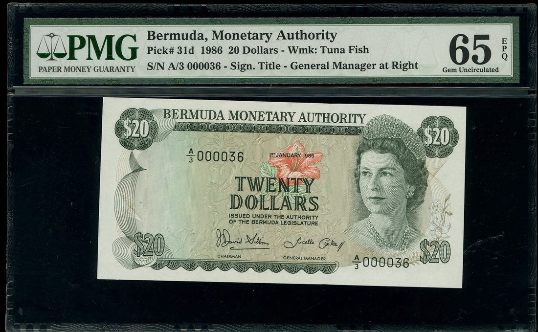 Bermuda Monetary Authority, $20, 1.1.1986, low serial number A/3 000036, (Pick 31d), PMG 65EPQ Gem Uncirculated